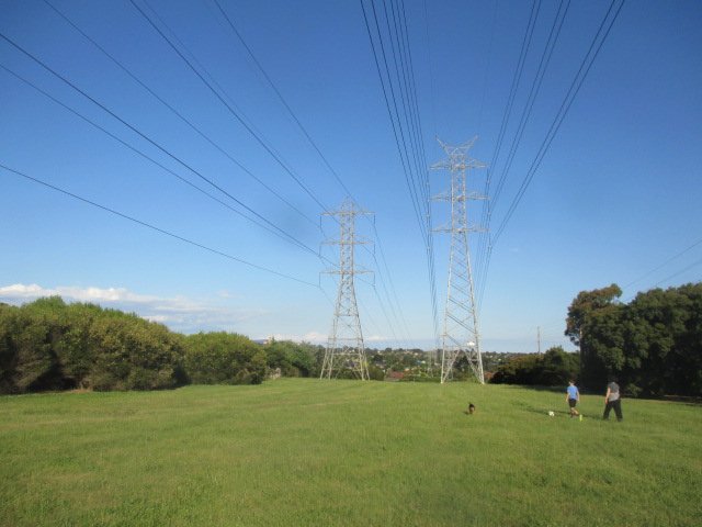 Highview Park Dog Off Leash Area offers a vast, naturalistic environment for dogs to exercise and socialize. The park is primarily characterized by its expansive grassy fields, which include areas of lush clover and some drier patches, providing a soft and varied surface for play. Mature eucalyptus trees and thick perimeter shrubbery offer ample natural shade, creating a pleasant atmosphere even on sunny days. The terrain is mostly flat but features some gentle slopes, adding variety to the landscape. While the park is bordered by a combination of wooden and chain-link fencing, the sheer scale of the open space is its most prominent feature. Notable landmarks include high-voltage power pylons that traverse the field and tall light poles, which may facilitate use during low-light hours. Although specific amenities like water fountains, benches, or waste stations are not explicitly captured in these images, the park provides a significant amount of room for long-distance running and fetch. It appears to be a popular spot for local pet owners seeking a large, open-air setting for their dogs to roam freely.