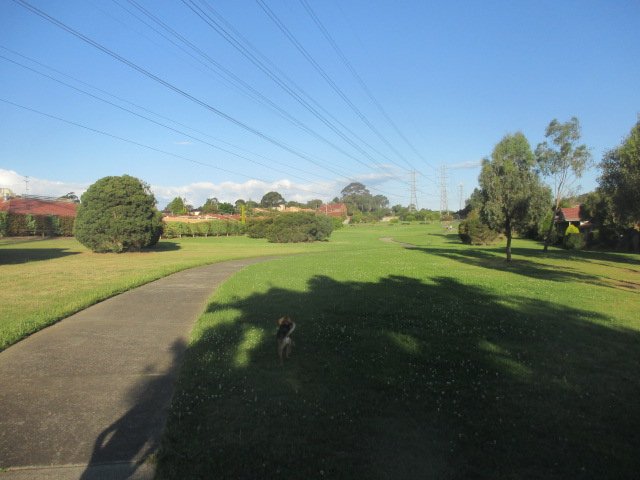 Whites Lane Retarding Basin Dog Off Leash Area is a sprawling, open green space located in a suburban setting, characterized by its vast grassy fields and prominent high-voltage power lines overhead. The park offers a significant amount of room for dogs to run and play freely, making it ideal for high-energy breeds that require large spaces. The ground surface is primarily natural grass, which appears well-maintained with patches of clover throughout. A paved walking path meanders through the area, providing a solid surface for owners to walk while their pets explore the adjacent fields. While the park features several mature trees and large shrubs that offer pockets of natural shade, there is a lack of visible man-made facilities such as benches, picnic tables, or water stations in the captured views. The terrain is mostly flat with some gentle slopes, consistent with its function as a retarding basin. There is no evidence of perimeter fencing in the images, suggesting an open-plan off-leash area rather than a contained enclosure. The atmosphere is peaceful and spacious, providing a naturalistic environment for canine exercise.