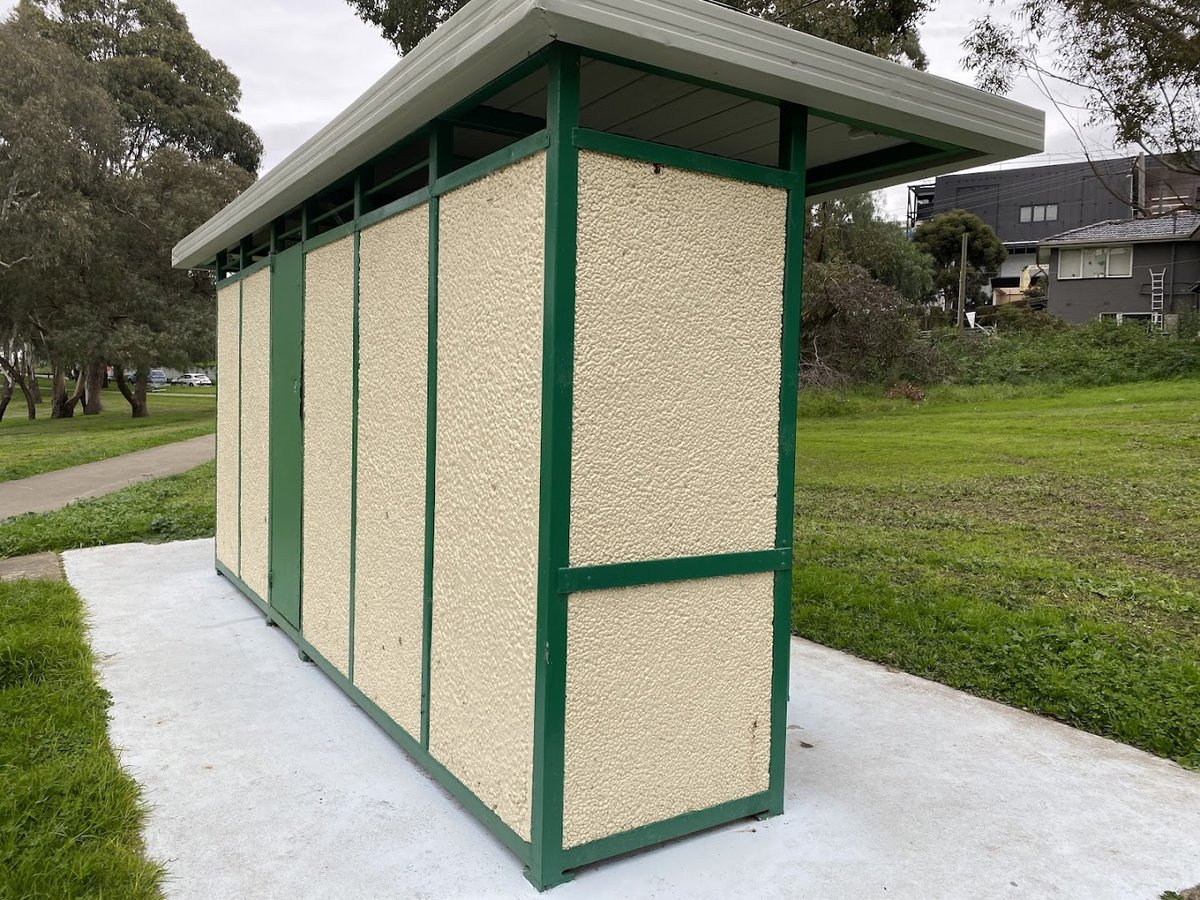 Poulter Reserve Dog Off Leash Area in Australia presents as a sprawling, naturalistic green space ideal for canine exercise. The park is characterized by its vast expanses of open grass and a significant population of mature eucalyptus trees that provide ample natural shade throughout the day. The ground surface is predominantly natural grass, with some areas of exposed earth under the denser tree canopies. A notable feature is the adjacent large, flat, and well-maintained green field, which offers a massive space for dogs to run and play fetch. The park's atmosphere is serene and suburban, with residential housing visible on the perimeter. Facilities include a paved walking path for easy access and a small, functional utility building that likely serves as a toilet block. While the area is designated for off-leash use, there is no visible perimeter fencing in the provided images, suggesting an open-plan reserve layout. No specific dog-centric amenities such as water stations, agility equipment, or waste bag dispensers are captured in these views, emphasizing a more rugged, natural park experience rather than a highly structured dog park.