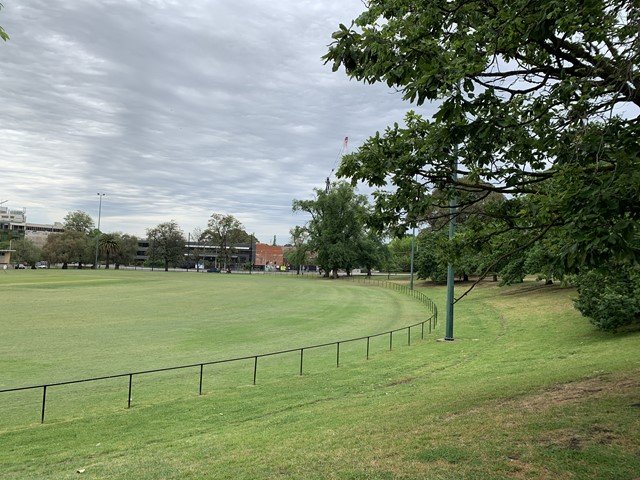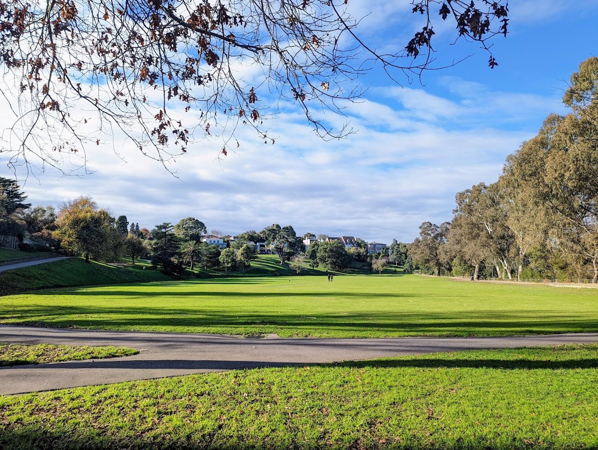 St James Park in Boroondara is a large, picturesque public park featuring expansive open grassy areas suitable for off-leash dog activities. The park is characterized by its lush green lawns, mature deciduous and evergreen trees providing ample natural shade, and a network of paved walking paths. Facilities include a dedicated water fountain with an integrated dog bowl, several park benches for resting, and a modern children's playground area with a woodchip surface. While the park features some low perimeter fencing and post-and-rail barriers near roads, it is not fully enclosed with high-security dog fencing. The terrain is mostly flat with some gentle slopes, offering a serene and spacious atmosphere for both dogs and their owners. The presence of a large oval suggests it is a multi-use space for sports and recreation. Overall, it provides a high-quality outdoor environment with essential amenities for a comfortable visit. The park's layout encourages long walks and active play, making it a popular destination for local residents and their pets.