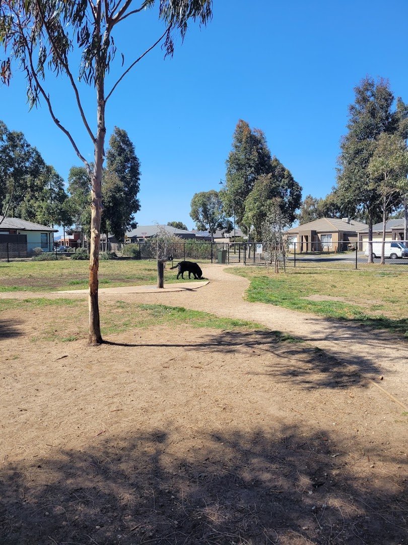 The Willmott Drive - Derrimut Road D1 Drainage Reserve Dog Off Leash Area in Australia offers a versatile environment for canine exercise and socialization. The park features a secure, fenced-in enclosure equipped with a chain-link perimeter, ensuring a safe space for dogs to play. Inside this area, visitors will find a dedicated water fountain/tap and a gravel walking path. The ground surface is a combination of grass and dirt, with some patches of mulch. Beyond the fenced section, the reserve opens up into a vast, grassy field lined with mature eucalyptus trees that provide ample natural shade. This expansive space is ideal for long-distance fetching and high-energy running. The park's proximity to a drainage reserve is highlighted by a nearby water feature with a weir, though this is separated from the main dog areas. Basic amenities include a waste bin for convenience. The atmosphere is peaceful and suburban, bordered by residential housing. While it lacks specialized agility equipment or picnic facilities, its primary draw is the sheer amount of open space and the essential provision of water and fencing.