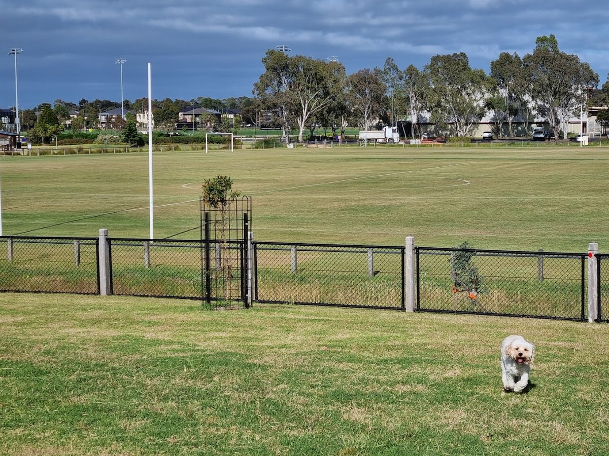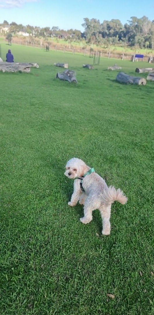 Tatterson Park Fenced Dog Park is a spacious and well-maintained off-leash facility located within the larger Tatterson Park in Keysborough, Victoria. The park features a large, fully fenced area with a predominantly grass surface, providing ample room for dogs to run and play. The facility is equipped with several amenities, including a sheltered picnic area with tables, multiple wooden benches for seating, and natural agility elements such as large logs for dogs to climb. The park is dotted with both young and mature trees, offering patches of natural shade throughout the day. A paved walking path runs alongside the perimeter of the dog area, which is adjacent to expansive sports fields and a modern playground with shade sails. The atmosphere is social and active, catering to dogs of all sizes. Practical features like trash cans and waste bag dispensers are located near the entry gates for convenience. The park's open layout and clear boundaries make it a popular destination for local pet owners seeking a secure environment.