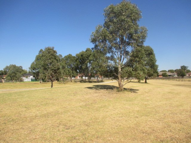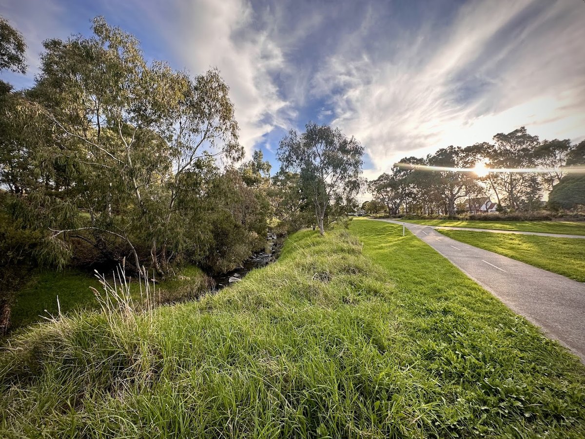 CW Kirkwood Reserve Dog Off Leash Area is a sprawling, naturalistic park located in Australia, offering a vast open space for dogs to exercise. The reserve is characterized by its expansive grassy fields, which transition between lush green and drier tones depending on the season. Numerous mature eucalyptus trees are scattered throughout the landscape, providing significant patches of natural shade for both pets and owners. The terrain is mostly flat with some gentle undulations and slopes, particularly near the small creek that runs through the area. A paved shared-use path meanders through the reserve, ideal for walking or jogging. While designated as an off-leash area, the park lacks a fully secure perimeter; only partial post-and-rail fencing and residential boundary fences are visible in the distance. There is no evidence of specialized dog park amenities such as agility equipment, water stations, benches, or waste disposal bins in the provided views. The atmosphere is serene and uncrowded, emphasizing a back-to-nature experience. It provides a large, unfettered environment for dogs to run freely, though owners should be mindful of the lack of complete containment.