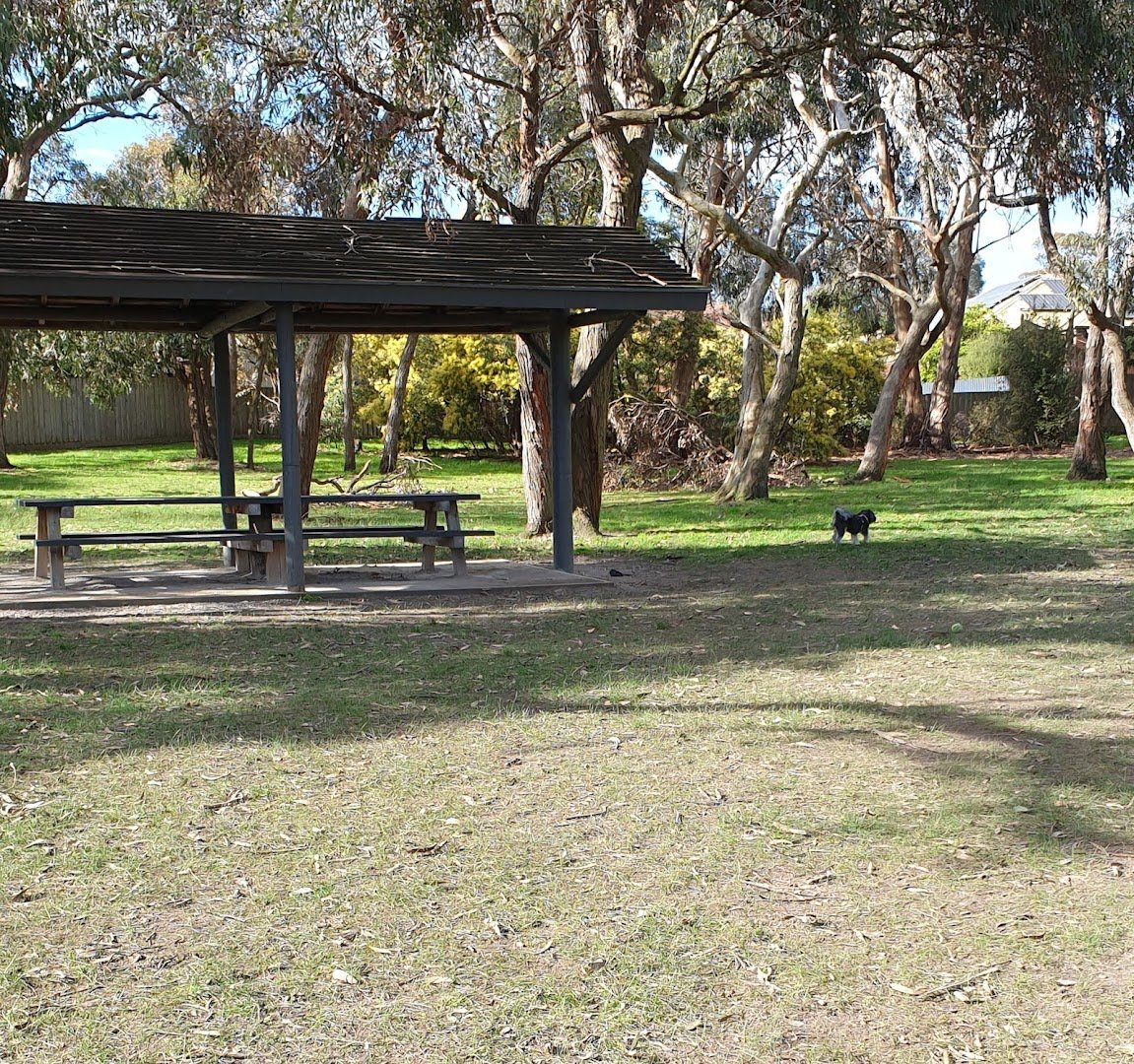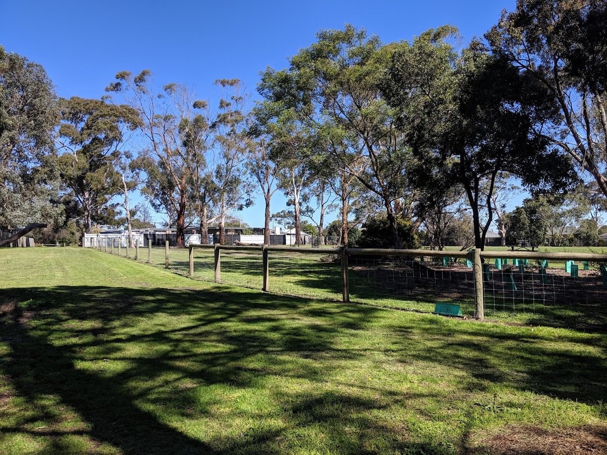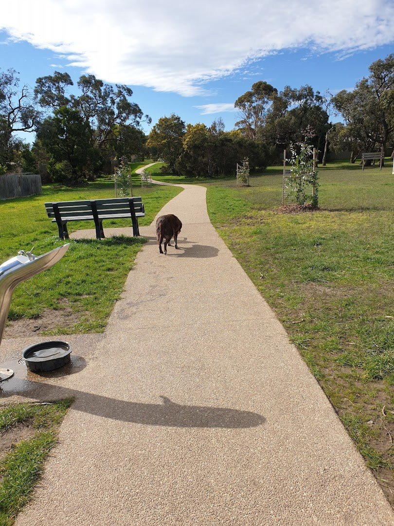 Melaleuca Reserve Dog Off Leash Area is a spacious and well-equipped park featuring large open grassy fields for dogs to run. The park is fully fenced, utilizing a combination of chain-link and wooden post-and-wire fencing. It offers excellent facilities, including a dedicated agility area with various obstacles like ramps, tunnels, and weave poles. For owners, there are multiple benches and picnic tables, some of which are sheltered under a large pavilion. The park is well-shaded by numerous mature trees and includes a paved walking path. Essential amenities such as a water fountain with an integrated dog bowl and trash cans are provided. The ground surface is primarily grass, though some areas show wear or dry patches depending on the season. The agility zone provides mental and physical stimulation for active dogs, while mature eucalyptus trees offer ample natural shade. The presence of a dedicated water station ensures pets stay hydrated. The perimeter is secured by sturdy fencing, giving owners peace of mind while their pets explore this expansive off-leash environment.