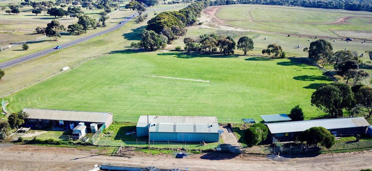 Lawrie Emmins Reserve Dog Off Leash Area offers an expansive and versatile environment for dogs and their owners. The park features a massive, flat, fenced grassy field, which appears to double as a sports oval, ideal for high-energy activities like fetch or long-distance running. This primary area is enclosed by a metal wire fence, providing a secure space for off-leash play. Beyond the main field, the reserve transitions into a more natural landscape with undulating terrain and gentle slopes, as seen in the ground-level views. This area is heavily populated with mature eucalyptus trees, offering ample natural shade and a more exploratory atmosphere for dogs. The ground surface is predominantly well-maintained grass, though some dirt tracks and service areas exist near the park's structures. While the images show several utility buildings, specific amenities like benches or water stations are not immediately prominent in the wide shots. The proximity to a large weir or river adds a scenic element to the reserve's boundary. Overall, the park provides a sense of openness and freedom, making it a premier destination for local dog owners seeking a large, naturalistic space for exercise.