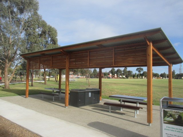 Scovell Reserve Dog Off Leash Area is a spacious, multi-use park featuring expansive grassy fields perfect for dogs to run and play. The park offers a mix of open sun and natural shade provided by mature eucalyptus trees. Facilities include a large sheltered picnic area with multiple tables and a barbecue station, making it a family-friendly destination. Paved walking paths wind through the reserve, connecting different sections and leading toward a scenic riverfront with a wooden viewing platform. The terrain is mostly flat with some gentle slopes, providing a varied environment for exercise. For convenience, the park is equipped with trash cans and benches. While the area is designated for off-leash use, there is no evidence of a fully enclosed perimeter fence in the images. A children's playground with woodchip surfacing is also located within the reserve, though dogs should be supervised in these shared spaces. The overall atmosphere is relaxed and community-oriented, with plenty of room for large dogs to roam and socialize in the open air.