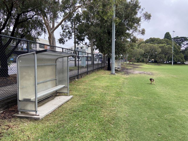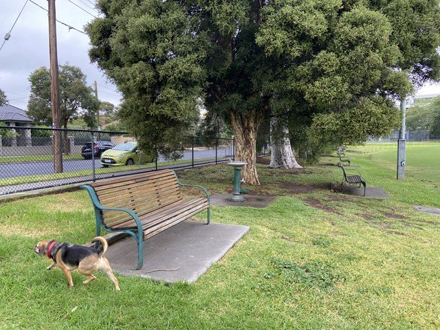 Waverley Park Dog Off Leash Area is a sprawling urban park in Australia, offering a variety of environments for dogs and their owners. The park is dominated by large, open grassy spaces, including well-maintained sports ovals and more rugged, sloping fields under high-voltage power lines. Mature trees are a key feature, providing significant natural shade across much of the area. For human comfort, there are several benches, including some with protective shelters. A dedicated dog drinking fountain is available to keep pets hydrated. While the sports fields are enclosed by chain-link fencing, other sections of the park have more open boundaries or are bordered by wooden fences and bollards. The park also includes some wooded sections with unpaved walking tracks. With its vast size and mix of facilities, it provides a relaxed atmosphere for off-leash exercise and social interaction. Tall floodlights suggest the area is used for evening sports, though general park lighting is not explicitly shown.