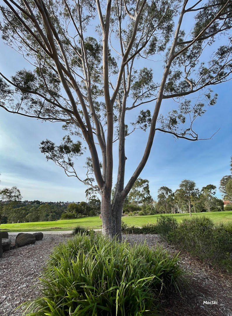 Village Green Dog Off Leash Area is a spacious and versatile public park featuring expansive grassy fields and gently sloped terrain, providing ample room for dogs to exercise. The park is well-equipped with essential facilities, including a modern, dedicated dog water fountain and conveniently placed trash cans. For human visitors, the area offers picnic tables, a sheltered gazebo for weather protection, and paved walking paths that wind through the landscape. The environment is characterized by mature eucalyptus trees that provide patches of natural shade across the green. Interestingly, the park also features a large, striking metal torus sculpture, adding a unique artistic element to the open space. It is situated adjacent to a scenic waterway, complete with a wooden viewing platform for enjoying the local nature. While much of the area feels open and integrated with the surrounding neighborhood, chain-link fencing is visible in certain sections. The ground surface is primarily natural grass, though some high-traffic areas consist of compacted gravel or dirt. Overall, the park offers a communal and active atmosphere for pets and owners alike.