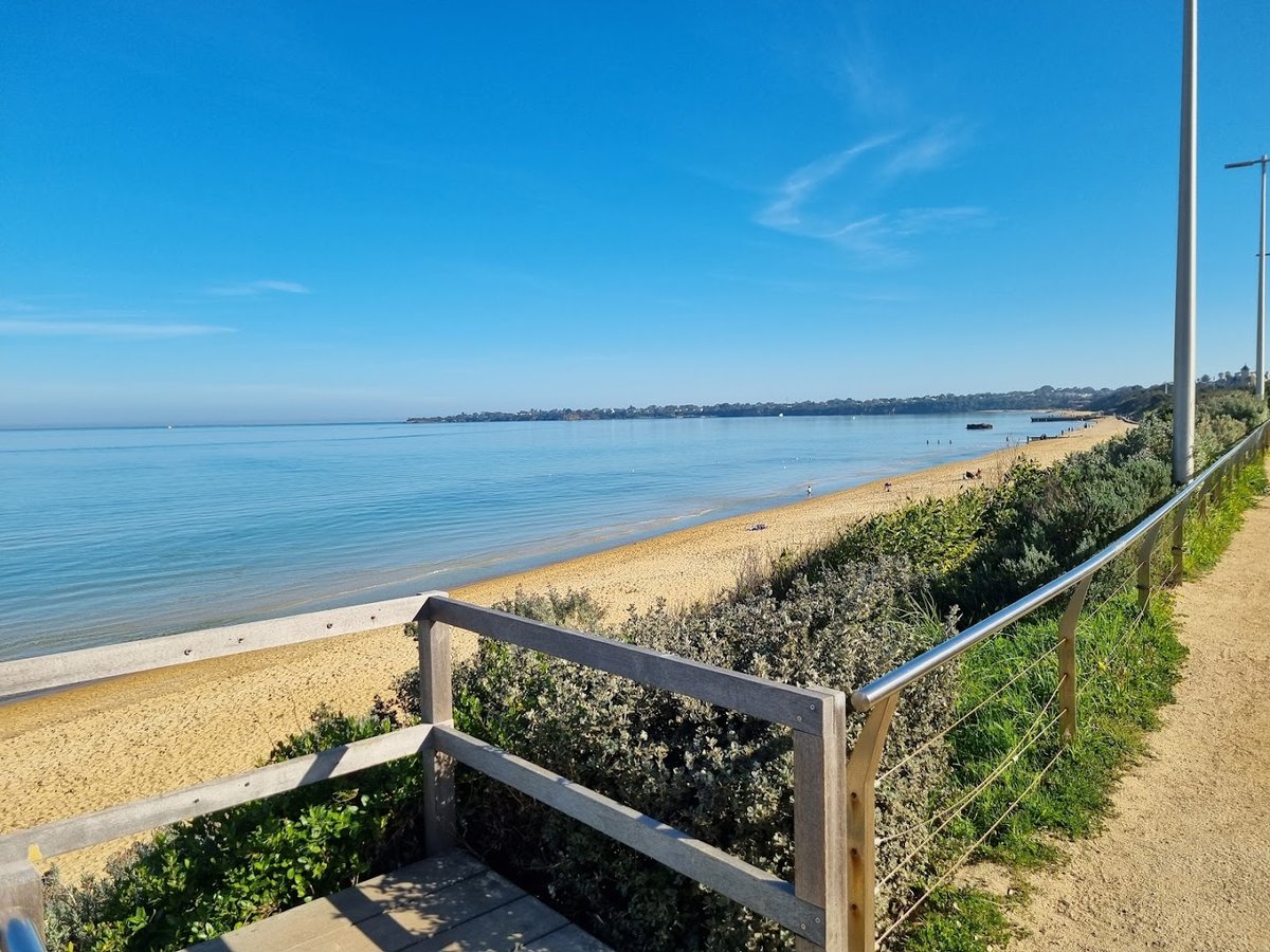Southern Road Reserve Dog Off Leash Area in Mentone, Australia, offers a vast and versatile outdoor space for dogs and their owners. The park is characterized by its expansive, flat grassy fields, which are frequently used as sports ovals but also serve as a popular off-leash destination. These large open areas provide ample room for dogs to run freely and socialize. The reserve is partially enclosed by low metal fencing, which helps define the boundaries without obstructing the view. Mature trees are strategically located around the perimeter and near the playground, providing essential shade during warmer days. Facilities include a well-equipped playground with a woodchip base, featuring swings and climbing frames, making it a family-friendly location. Several park benches are scattered throughout, offering places for owners to rest. Tall stadium-style lighting is present, indicating the park's use for evening activities. While the primary surface is natural grass, there are sections of artificial turf for cricket. The inclusion of a coastal image suggests the park's proximity to local beaches, adding to the area's appeal for diverse outdoor recreation. The overall atmosphere is open, clean, and welcoming for the local community.