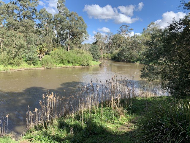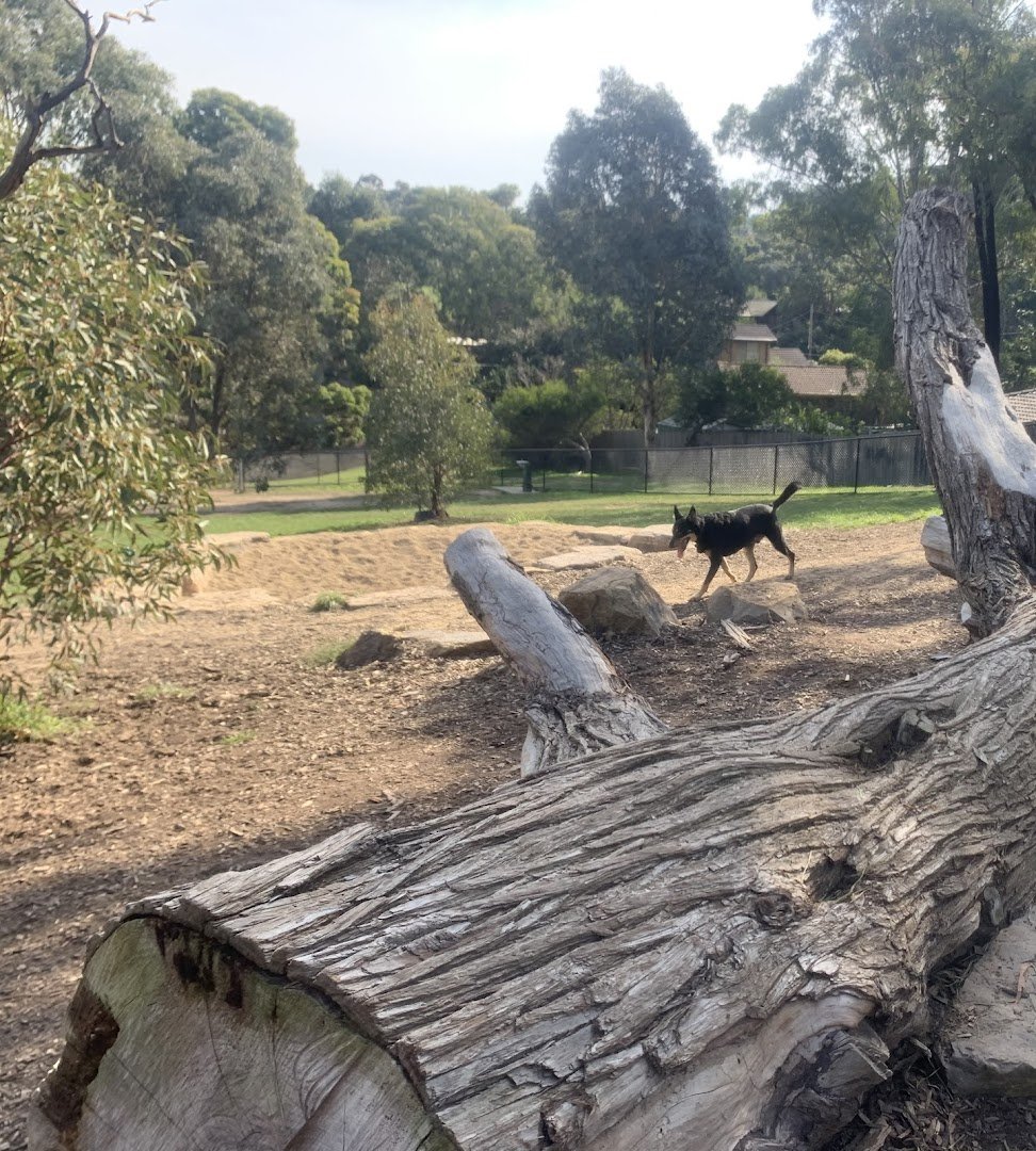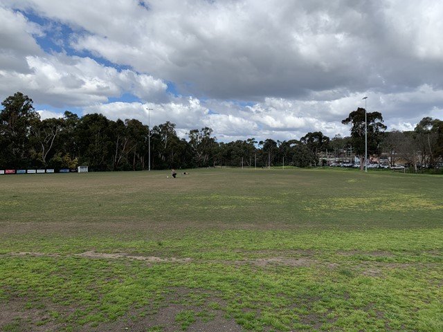 Mandella Street Reserve in Australia offers a diverse outdoor environment for visitors and their pets. The park features a significant amount of natural shade provided by a dense canopy of mature trees, creating a cool and inviting atmosphere. A key highlight is the dedicated fenced dog enclosure, which provides a secure space for pets to exercise. Inside this area, the ground surface is a mix of mulch and gravel, accented with natural play elements like large fallen logs and rocks. Beyond the fenced section, the park boasts a sprawling, well-maintained grassy field equipped with tall floodlights, suitable for sports and large-scale activities. Paved walking paths wind through the reserve, accompanied by sturdy park benches for rest. The park's perimeter is partially bordered by a scenic river or creek, offering picturesque views and a connection to the local ecosystem. While some areas feature temporary blue mesh fencing, the permanent facilities include metal chain-link fences and trash disposal stations. This versatile space combines functional sports facilities with natural bushland aesthetics, making it a popular spot for local residents.