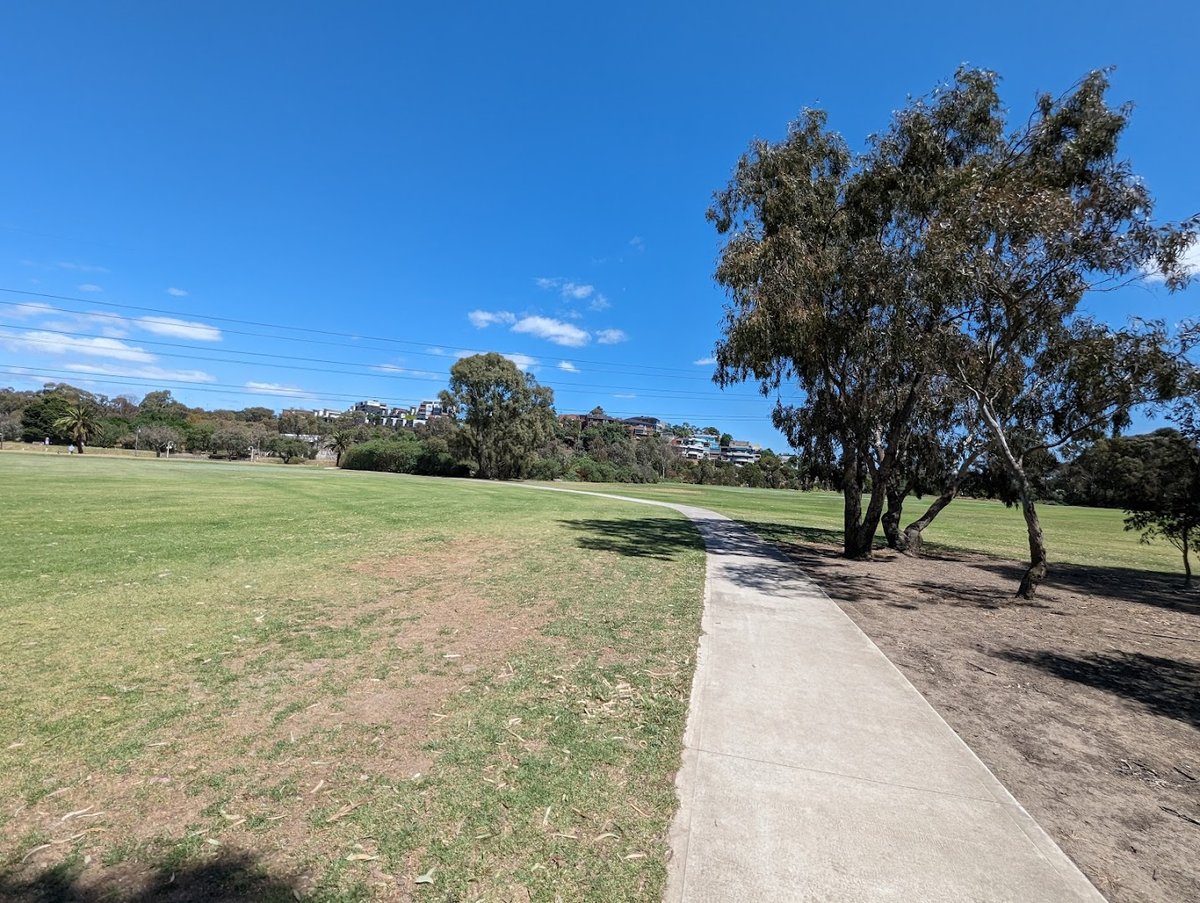 Aberfeldie Park Dog Off Leash Area in Australia provides a versatile environment for pet owners, featuring both expansive open parkland and a dedicated fenced enclosure. The main park area consists of vast, well-maintained grassy fields perfect for long-distance fetching and walking along the scenic Maribyrnong River. A paved concrete path winds through the park, accommodating both pedestrians and cyclists. The specific fenced dog park section utilizes a durable dirt and gravel surface, which is ideal for high-traffic play and prevents the area from becoming muddy. This enclosed space is secured by a sturdy chain-link fence with wooden support posts. Facilities within the fenced area include a specialized stainless steel dog water fountain and wooden benches for owners to rest. While the fenced area is mostly open to the sky, the surrounding park is dotted with mature eucalyptus and palm trees that offer ample natural shade. The overall atmosphere is vibrant and welcoming, catering to a variety of dog breeds and sizes. The park's topography includes gentle slopes and natural wetland areas near the river, adding to the visual appeal and variety of the landscape.