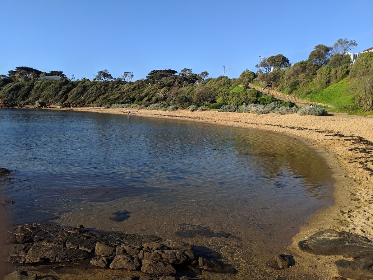 Daveys Bay Beach Dog Off Leash Area is a picturesque coastal destination located in Mount Eliza, Victoria. This natural dog-friendly space is characterized by its sandy shoreline and clear, shallow waters of Port Phillip Bay, making it an ideal spot for dogs that enjoy swimming. The beach is situated at the base of steep, lushly vegetated cliffs, which are accessible via wooden staircases and winding paths. The ground surface is primarily natural sand, interspersed with rocky sections and coastal scrub. While the area offers a large, open environment for off-leash exercise, it lacks traditional park infrastructure such as fencing, agility equipment, or dedicated lighting. Facilities in the vicinity include the Daveys Bay Yacht Club and iconic colorful beach huts, though these are not specific to the dog area. Shade is provided naturally by the surrounding cliffs and mature trees on the slopes. The atmosphere is serene and scenic, offering expansive views across the water toward the Melbourne skyline. It is a rugged, natural setting rather than a manicured park, providing a unique off-leash experience for pets and owners alike.