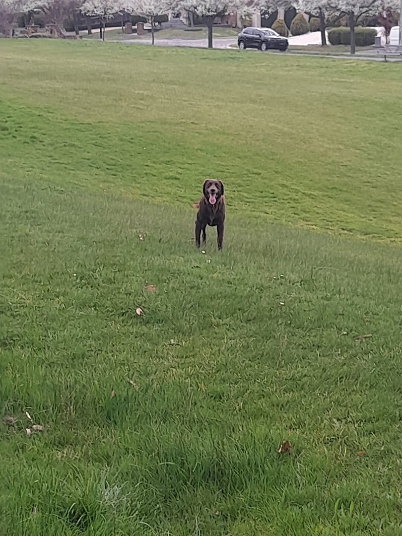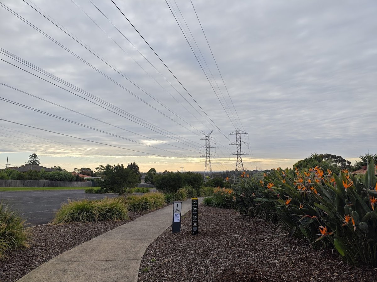 The Powerlines Area Legana - Toombah Street Dog Off Leash Area is a sprawling suburban recreational space in Australia, notable for the large electrical pylons that traverse the landscape. This expansive park offers a variety of environments for dogs and their owners, featuring wide-open grassy fields perfect for high-energy play and long-distance fetching. The terrain includes both flat sections and gentle slopes, providing a natural workout for visiting pets. A well-maintained concrete path provides easy access through the park, flanked by attractive landscaping including mulch beds and vibrant Bird of Paradise plants. While the park is not a fully enclosed dedicated dog run, it is bordered by residential wooden fencing and chain-link fences used for adjacent sports fields. Mature trees are scattered throughout, offering essential natural shade on sunny days. Practical amenities include a paved asphalt parking lot and clear signage designating the off-leash status. The atmosphere is peaceful and open, though the presence of tall light poles suggests the area is used for various community activities. The primary ground surface is natural grass, which shows some wear in high-traffic spots.
