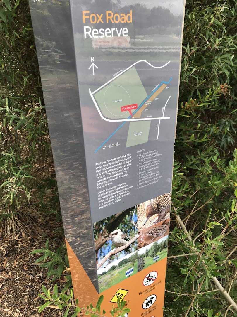 Fox Road Reserve is a spacious and versatile park featuring both expansive open recreational areas and a dedicated fenced dog off-leash section. The reserve spans approximately 1.3 hectares along the scenic Troups Creek, offering a serene natural atmosphere characterized by numerous mature eucalyptus trees that provide ample natural shade. The primary ground surface throughout the park is well-maintained grass, which is ideal for various activities including soccer and dog exercise. The specific dog off-leash area is securely enclosed with chain-link fencing, allowing pets to run freely and safely. Park facilities include several benches strategically placed under trees for visitors to rest and enjoy the surroundings. While the main informational signage for the broader reserve indicates that dogs should be kept on leads, the presence of the dedicated fenced enclosure confirms a designated off-leash zone for local pet owners. The park's landscape features large open spaces with some gentle slopes, blending functional sports fields with natural bushland elements. It provides a peaceful environment for both community sports and individual pet recreation.