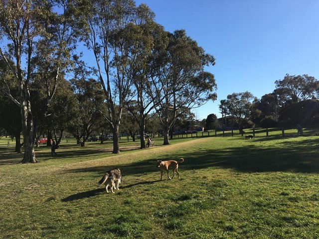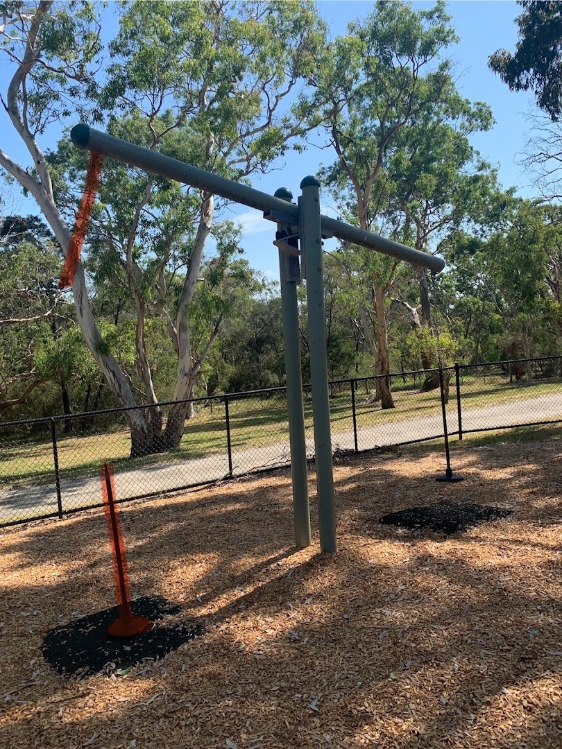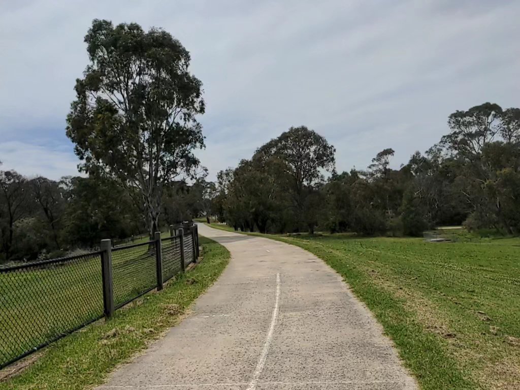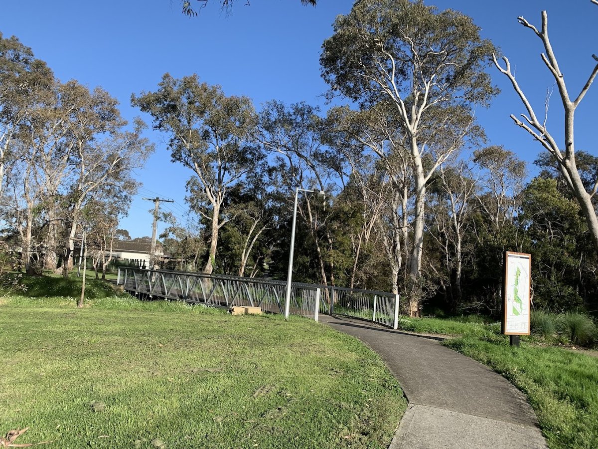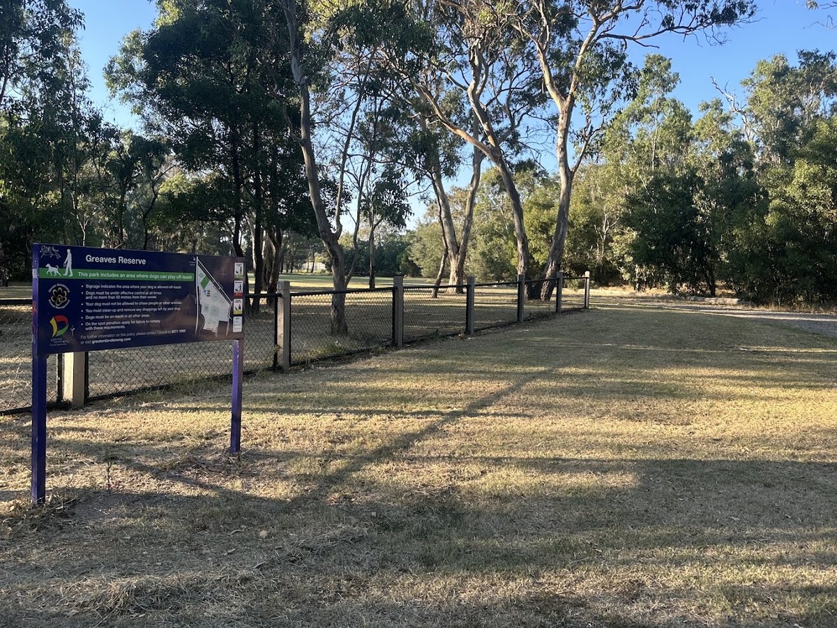 Fotheringham Reserve (identified as Greaves Reserve on local signage) provides a sprawling, naturalistic setting for canine exercise in Australia. The park is characterized by its expansive grassy fields, which offer ample room for dogs to run and interact. Mature eucalyptus trees are a prominent feature, casting wide patches of shade across the landscape, which is essential for comfort during warmer days. The area is partially secured with chain-link fencing, though it maintains an open feel as it borders natural bushland and a small creek. A paved pathway system, including a sturdy metal bridge, allows for easy navigation through the reserve's varied terrain. While the primary surface is natural grass, woodchips are utilized around specific equipment, and concrete paths serve walkers and cyclists. Amenities include park benches and a designated off-leash zone as indicated by official signage. The overall atmosphere is one of a quiet, community-focused green space that balances functional dog-exercise areas with preserved natural elements like the central waterway and dense perimeter vegetation.