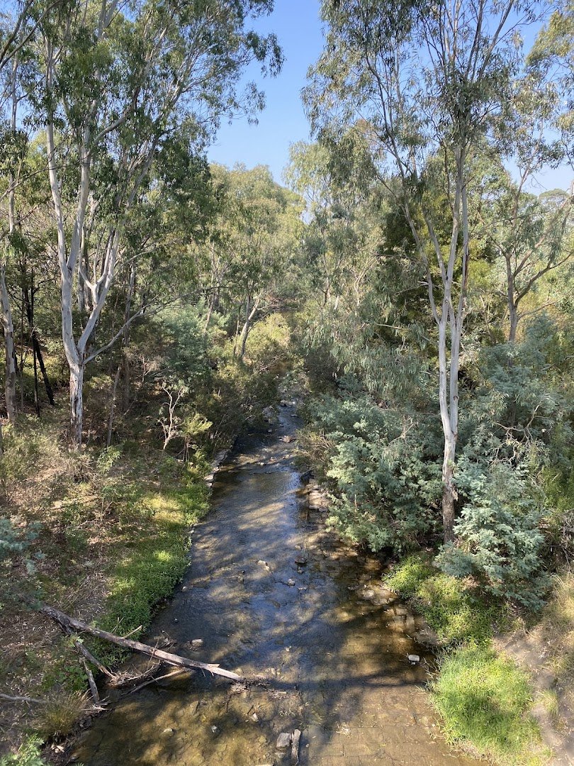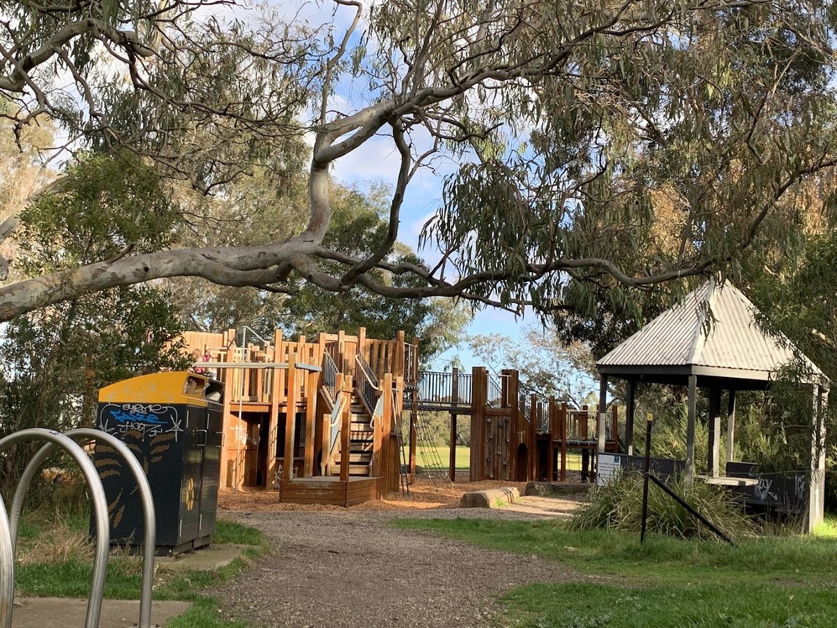 Merri Park Dog Off Leash Area is a sprawling and picturesque public space in Australia, offering a variety of environments for dogs and their owners. The park is dominated by vast, lush green grass fields, providing a massive open space for off-leash exercise and play. Mature native trees, including large eucalypts and palms, offer significant natural shade across the grounds. For human visitors, the park is well-equipped with several picnic tables, some situated on concrete bases, and a sheltered gazebo. A standout feature is the impressive, multi-story wooden playground, making the park a popular spot for families. While the park includes a fenced sports oval and some chain-link fencing near buildings, the general dog area is not fully enclosed, though low post-and-rail fences provide some boundary near adjacent streets. The presence of Merri Creek nearby adds a serene natural element to the landscape. With its combination of functional facilities like trash cans and bike racks, and its expansive natural beauty, the park maintains a welcoming and active community atmosphere.