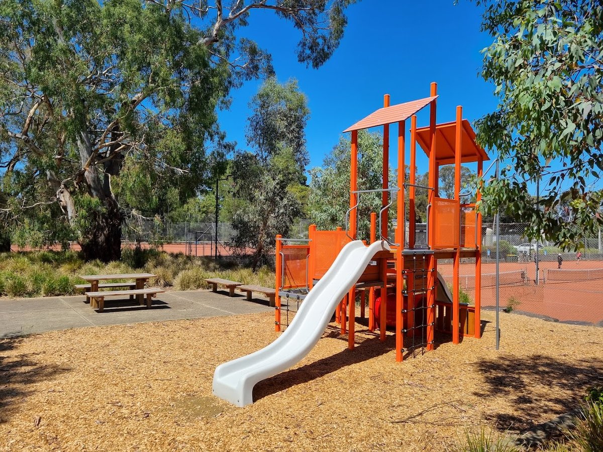 Nicoll Park Dog Off Leash Area is a sprawling and picturesque recreational space in Australia, offering a blend of natural beauty and functional amenities. The park is defined by its vast, rolling grassy fields and a significant number of mature trees that provide extensive natural shade throughout the day. A standout feature is the dedicated dog agility course, which includes a variety of equipment such as tunnels, jumping hoops, and ramps arranged along a natural dirt track. The park's topography is notably sloped, providing a challenging and engaging environment for dogs to exercise. Beyond the off-leash areas, the park caters to families with a modern playground featuring bright orange structures and slides, as well as picnic tables and benches for relaxation. Boundary fencing, primarily consisting of tall wooden panels, separates the park from adjacent residential areas, while chain-link fences enclose nearby tennis courts. The overall atmosphere is peaceful and open, making it an ideal destination for pet owners seeking a large, well-equipped space for their dogs to roam freely and socialize in a natural setting.