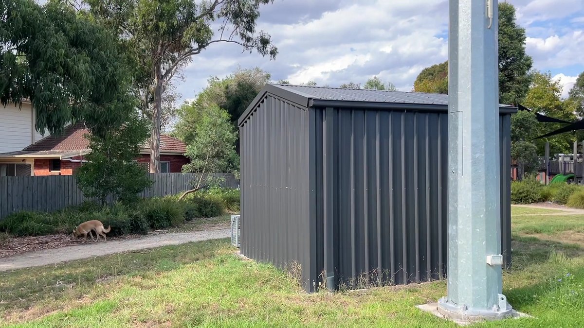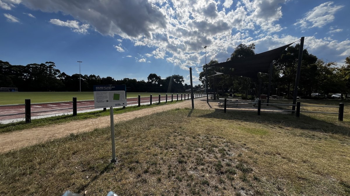 Davies Reserve Dog Off Leash Area is a versatile community park located in Oakleigh South, Australia. The facility offers a spacious environment for dogs to exercise, featuring a designated off-leash zone as confirmed by park signage. The ground surface is a mix of expansive green grass and natural dirt patches, particularly around the base of the many large, mature trees that provide significant natural shade across the site. In addition to the natural canopy, there is a modern picnic area equipped with tables and benches situated under a large black shade sail for sun protection. The park is partially enclosed with a variety of fencing types, including chain-link and wooden structures. Beyond the dog-specific areas, the reserve includes a large open sports field, a children's playground, and a brick pavilion building. Practical amenities such as trash cans with color-coded lids are available for waste disposal. The presence of tall floodlights indicates that the park is well-equipped for use during different times of the day. The overall atmosphere is open and welcoming, catering to both pet owners and the broader local community.