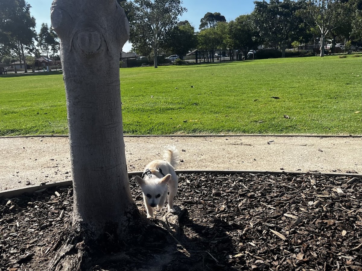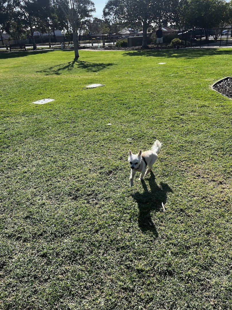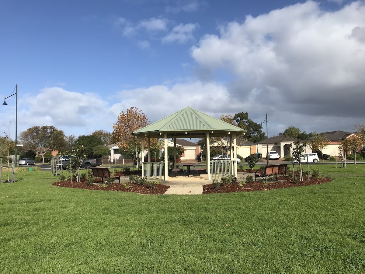 The Strand Dog Off-Leash Park in Australia offers a spacious and well-maintained environment for canine exercise and socialization. The park features expansive, flat grassy fields that provide ample room for dogs to run and play freely. A prominent feature is a large, green-roofed gazebo situated in a central location, which houses picnic tables and offers a shaded retreat for owners. Additional seating is provided by several wooden benches placed around the landscaped areas. The park is bordered by a sturdy black metal fence, ensuring a degree of safety and containment from the surrounding residential neighborhood and adjacent sports facilities, such as the nearby soccer field. Mature and newly planted trees are scattered throughout the site, offering patches of natural shade and visual appeal. Concrete pathways wind through the park, enhancing accessibility for all visitors. While the images do not explicitly show water stations or waste bag dispensers, the overall infrastructure, including park lighting and well-kept grounds, suggests a high-quality community facility. The atmosphere is peaceful and suburban, making it an ideal spot for local dog owners to gather.