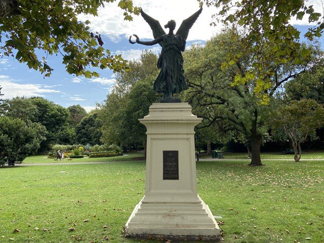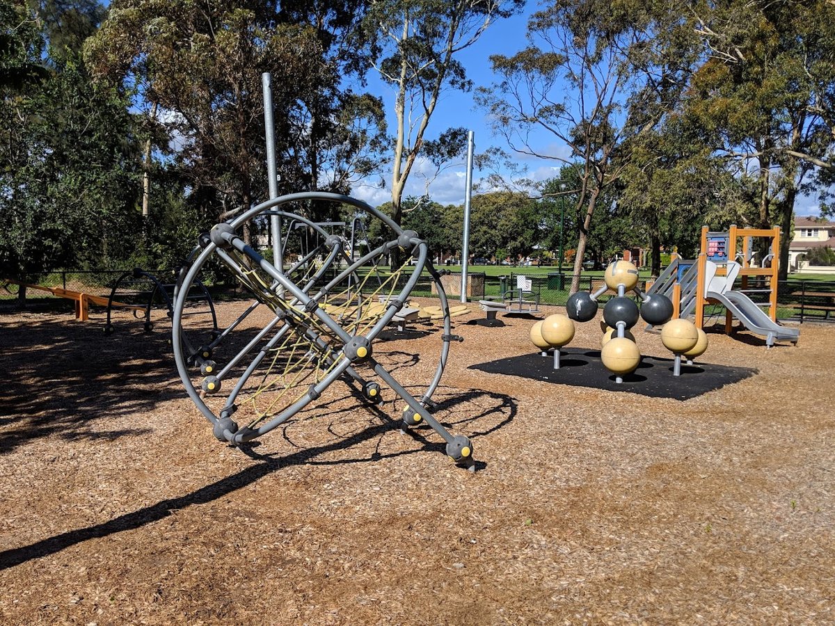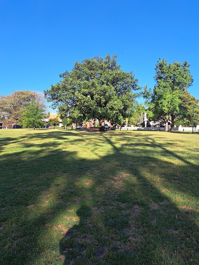 Lumley Gardens Off-Leash Area is an expansive and picturesque urban park located in Australia, offering a vast expanse of lush green grass for dogs to exercise. The park is notable for its large, open fields that provide ample space for off-leash activities. Mature, leafy trees are scattered throughout the grounds, providing plenty of natural shade for both pets and their owners. For families, there is a well-equipped playground featuring modern climbing structures and slides, situated on a safe woodchip surface. Visitor amenities include several benches and picnic tables, as well as trash bins for convenience. The park also features a prominent historical statue on a stone pedestal. Tall floodlights are present, suggesting the area is well-lit for use during darker hours. While there is some perimeter fencing and a fenced playground, the dog area itself is largely open, blending into the surrounding suburban landscape. The overall atmosphere is serene and community-oriented, making it a popular spot for local residents and their canine companions.