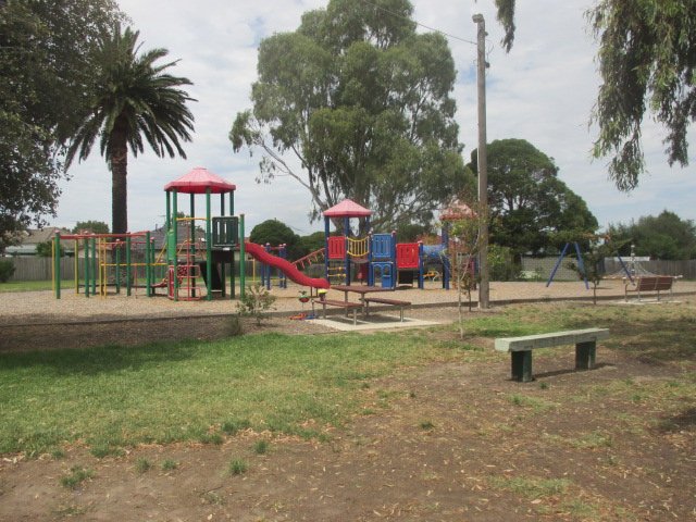 AG Davis Park Dog Off Leash Area in Australia provides an expansive and multi-functional outdoor space suitable for various activities. The park is characterized by its large, open grassy fields, which include a soccer goal, suggesting it serves as a sports ground while allowing for off-leash dog exercise. The landscape is dotted with numerous mature, leafy trees that provide ample natural shade, creating comfortable spots for visitors. Amenities include several wooden benches and picnic tables, some of which are strategically placed under the tree canopy for relief from the sun. A significant feature for families is the large, colorful playground area with multiple structures. The ground surface is predominantly natural grass, though some areas show wear with exposed dirt, and paved concrete paths wind through the park for easy accessibility. While the park is bordered by residential wooden fences and low metal railings in certain sections, it lacks a fully enclosed, secure perimeter specifically for dogs. A unique natural element is a cluster of large boulders, adding visual interest and a climbing opportunity for pets. The overall atmosphere is peaceful and community-oriented.