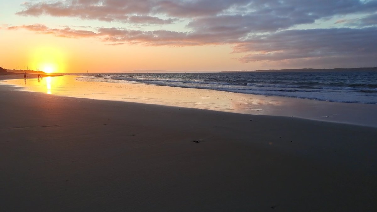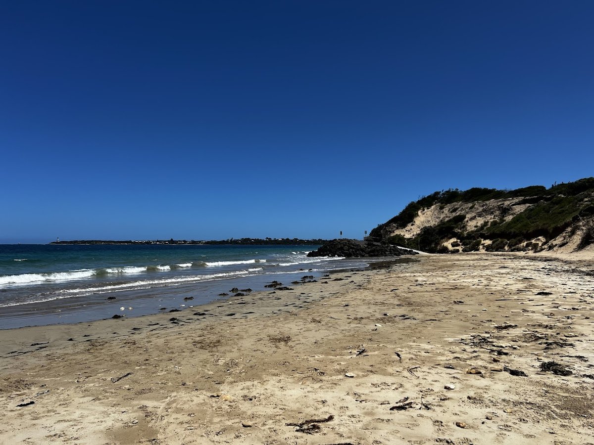 Point Lonsdale Dog Beach is an expansive and scenic coastal area located in Victoria, Australia. The park is characterized by its wide, sandy shoreline and rolling dunes, providing a vast open space for dogs to run and play. Based on the images, the primary surface is natural sand, which transitions into grassy bluffs and mulched areas near the entry points. The atmosphere is serene and natural, especially during sunset, offering a picturesque environment for pet owners. Facilities are minimal, reflecting its status as a natural beach rather than a structured urban dog park. While there are no enclosed fenced areas, the beach appears to be an off-leash zone where dogs can roam freely and swim in the ocean. Visible amenities include a wooden picnic table and a small shed on the grassy overlook, but there is no evidence of dedicated water stations, dog waste bags, or lighting. Shade is very limited on the beach itself, with only sparse coastal vegetation providing cover. This location is ideal for active dogs who enjoy large spaces and water activities in a beautiful, unfenced maritime setting.