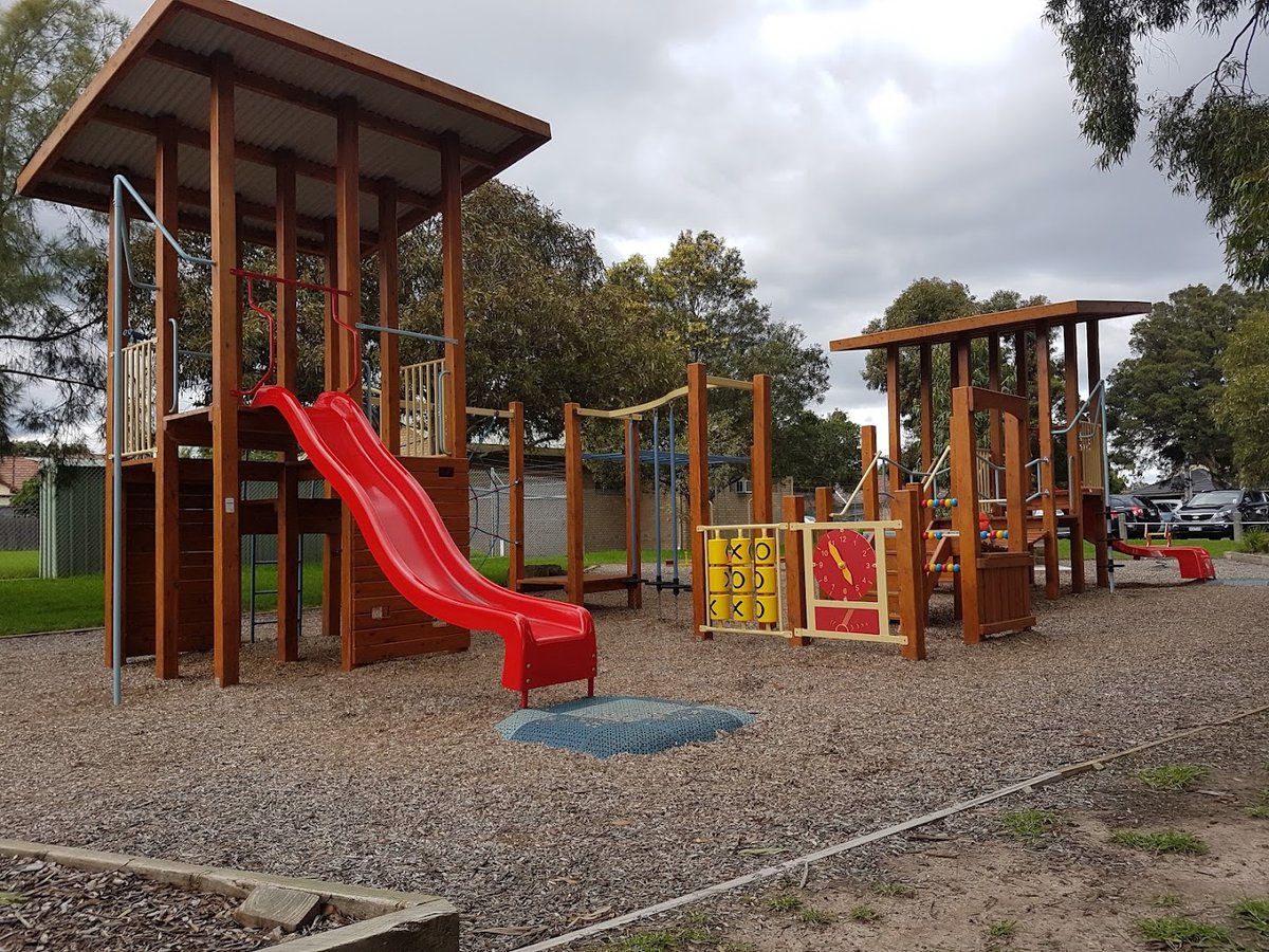 Crispe Park Dog Off Leash Area in Australia offers an expansive and versatile outdoor space for dogs and their owners. The park features a combination of large, open grassy fields, which appear to be used as sports ovals, and more secluded, wooded areas with mature trees providing ample natural shade. A dedicated fenced section is visible, featuring a black chain-link fence and a concrete perimeter path, ideal for secure play. The ground surface is primarily well-maintained grass, though some areas under tree cover have a more natural dirt and grass mix. For human visitors, the park includes a significant wooden playground structure with multiple slides and climbing frames, making it a family-friendly destination. Tall floodlights suggest the area is equipped for evening use. A building that appears to be a public toilet block is situated near the large open field. While specific dog-centric amenities like water stations or waste bags aren't explicitly shown, the sheer scale of the off-leash area provides plenty of room for exercise and socialization in a suburban setting.