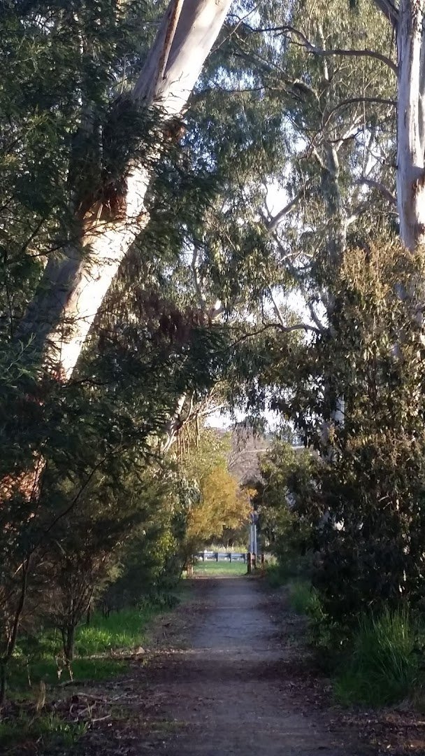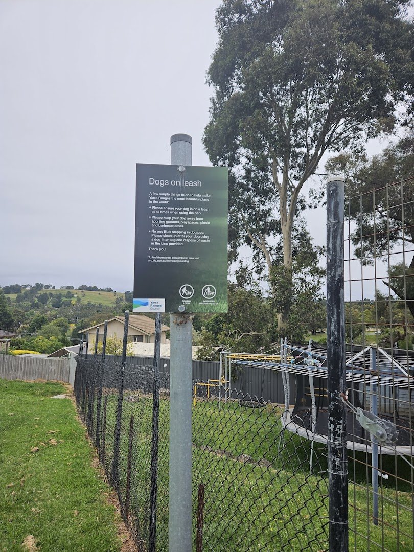 Hickman Place Dog Area, located within the Yarra Ranges, offers a serene environment characterized by expansive green spaces and mature vegetation. The area features a large, well-maintained grassy sporting field, which appears to be used for cricket, surrounded by perimeter fencing and tall floodlights for evening use. While the location is associated with dog walking, a prominent regulatory sign explicitly states 'Dogs on leash' and provides directions to the nearest off-leash zones, suggesting strict leash requirements in the immediate vicinity of the sporting grounds and residential boundaries. The park's landscape is varied, including sloped grassy sections and a shaded dirt path winding through a dense canopy of eucalyptus trees. For visitor comfort, there is at least one wooden bench set on a concrete base, nestled under trees against a picturesque ivy-covered wall. The perimeter is partially secured with chain-link fencing, particularly near residential properties. The atmosphere is peaceful and suburban, emphasizing shared use between sports enthusiasts and dog walkers, provided pets remain under control as per local council regulations.