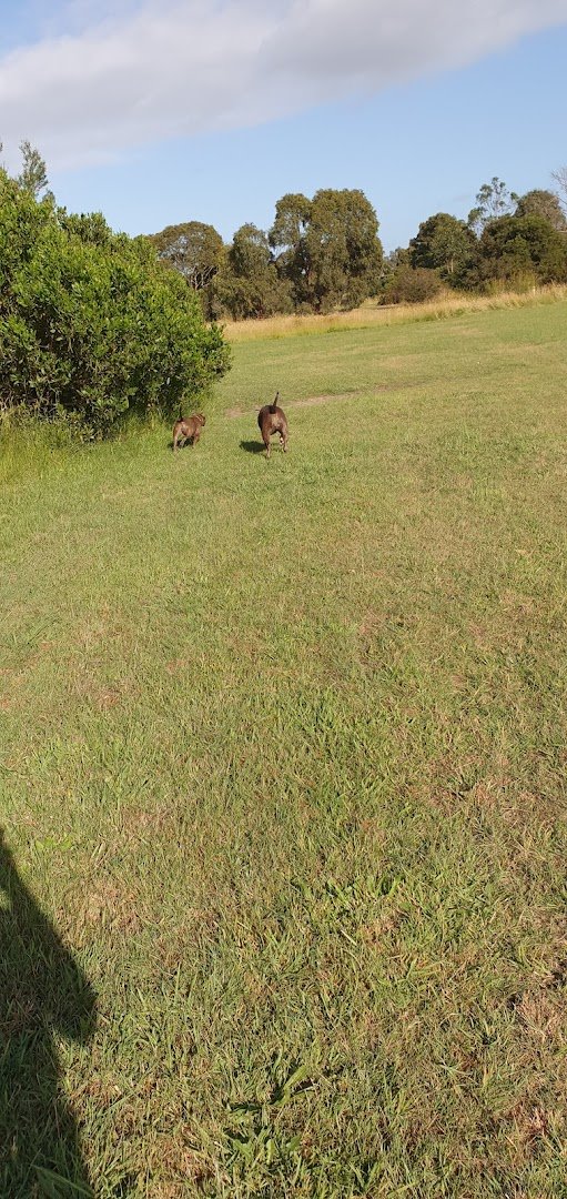 Grant Road Reserve Fenced Dog Park in Australia offers a spacious and inviting environment for canine exercise. The park is characterized by its expansive, undulating grassy fields that provide ample room for dogs to run at full speed. The terrain features gentle slopes, adding variety to the landscape. The entire area is securely enclosed, utilizing a combination of post-and-rail fencing reinforced with wire mesh and sections of black metal fencing. For the comfort of visitors, several sturdy wooden benches are positioned throughout the park, allowing owners to rest while keeping an eye on their pets. Mature trees around the perimeter and within the park offer significant patches of natural shade, which is essential during warmer days. A double-gated entry system is visible, ensuring a safe transition for dogs entering and exiting the off-leash area. While the park itself is focused on open space, the adjacent reserve features a picturesque wetland with a wooden boardwalk. A children's playground is also located nearby, making it a family-friendly destination. No specific water fountains, waste bag dispensers, or agility equipment are clearly visible in the provided images.
