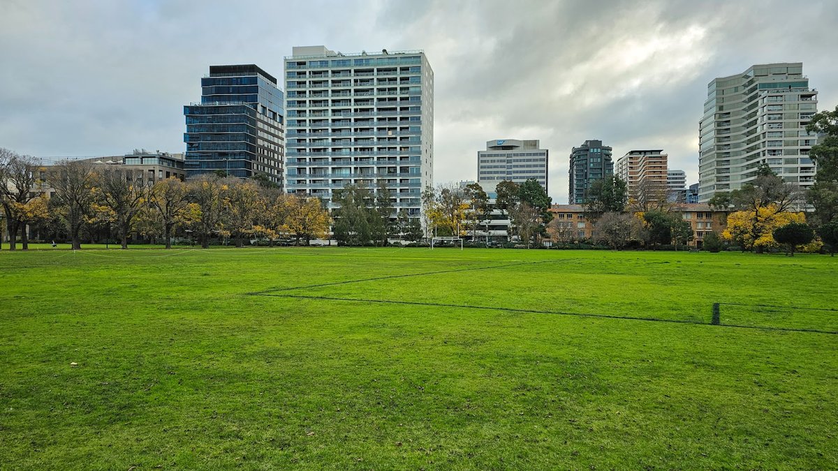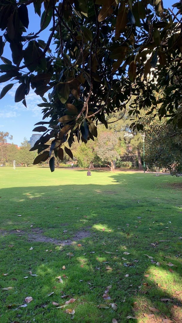 Fawkner Park Off-Leash Area is a sprawling, multi-use urban park in Melbourne, Australia, characterized by its vast, well-manicured green lawns and mature, shady trees. The park features a mix of open spaces, including large sports ovals and dedicated off-leash zones, providing ample room for dogs to run and play. The ground surface is predominantly high-quality grass, complemented by a network of paved asphalt paths for walking and cycling. Facilities include water fountains, picnic tables, and benches scattered throughout the grounds. While some sports areas are enclosed by chain-link fencing, much of the park remains open, blending seamlessly with the surrounding urban landscape. The atmosphere is peaceful and communal, with a backdrop of city high-rises. Mature trees, including large figs and elms, offer significant natural shade. The park's size and variety of terrains, from flat fields to gentle slopes, make it a popular destination for dog owners and outdoor enthusiasts alike.