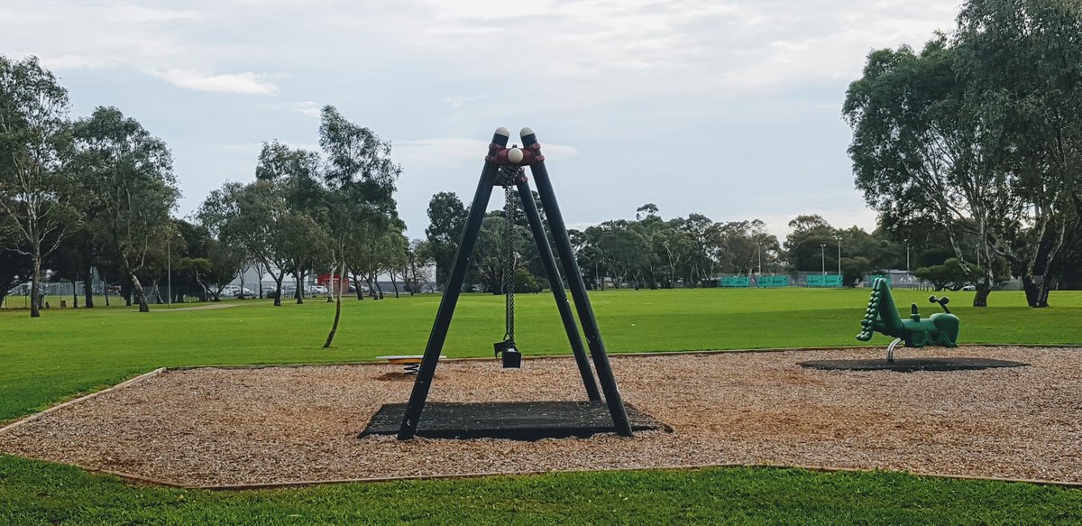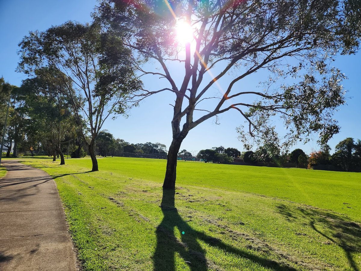 Warner Reserve Dog Off Leash Area is a sprawling public park in Australia characterized by its vast, open grassy spaces and mature tree canopy. The park provides a significant amount of room for dogs to run freely, with the primary ground surface being natural grass that varies from lush green to drier tones. Mature eucalyptus trees are scattered throughout, offering ample natural shade for visitors. A paved perimeter path is visible, suitable for walking or jogging. The park includes a dedicated playground area for children, featuring swings and spring riders on a mulch surface. While some sections feature wire and post or chain-link fencing, the area appears to be a large, mostly open reserve rather than a small, fully enclosed pen. The atmosphere is quiet and suburban, bordered by some industrial structures and featuring a telecommunications tower. There is no visible evidence of specialized dog facilities like water stations, agility equipment, or waste bag dispensers in the provided images, though the sheer scale of the green space makes it a popular destination for off-leash exercise.
