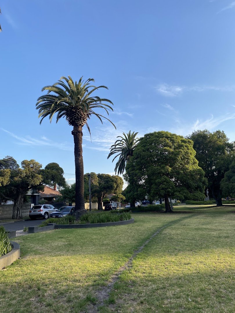 Greenmeadows Gardens Dog Off Leash Area is a beautifully maintained suburban park located in Australia, offering a serene environment for both dogs and their owners. The park features expansive, lush green lawns that provide ample space for dogs to run and play freely. Mature, leafy trees are scattered throughout the grounds, offering significant natural shade and creating a picturesque, garden-like atmosphere. The terrain is predominantly flat, making it accessible for easy walking. Facilities include well-paved walking paths that bisect the grassy zones, strategically placed wooden benches for resting, and conveniently located trash cans to help maintain cleanliness. While the park includes landscaped garden beds protected by low decorative fencing, the main dog off-leash area appears to be an open-plan space rather than a fully enclosed pen. The presence of a nearby basketball court suggests a multi-use recreational space. The overall vibe is peaceful and community-oriented, characterized by its clean surroundings and well-kept flora, including unique features like tall palm trees and vine-covered walls that add to the park's aesthetic appeal.