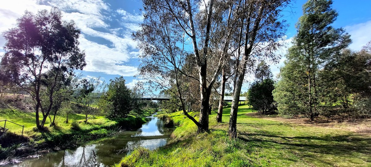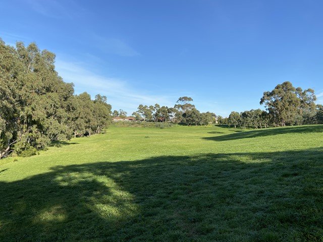 Killeen Street Reserve offers a diverse outdoor environment for visitors and their pets. The park features expansive, undulating green grassy fields interspersed with mature eucalyptus trees that provide ample natural shade. A key feature is a dedicated fenced dog area, constructed with chain-link fencing, which includes a paved internal path and metal benches for owners. Beyond the fenced section, the reserve encompasses a scenic creek with a pedestrian bridge, adding a natural element to the landscape. For fitness enthusiasts, there is a modern outdoor exercise station with various bars and benches. The terrain varies from flat open spaces to gentle slopes near the waterway. While the broader reserve is designated as an on-leash area, the fenced enclosure provides a secure space for dogs to interact. The overall atmosphere is peaceful and well-integrated into the surrounding suburban neighborhood, making it a versatile spot for walking, exercise, and pet recreation.