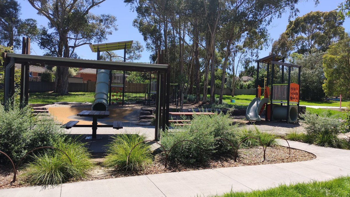 Swanston Reserve Dog Off Leash Area in Australia is a spacious and versatile community park that caters to both pet owners and families. The reserve features a large, open grassy expanse perfect for dogs to exercise and play, surrounded by a dense border of mature eucalyptus trees that provide significant natural shade. While the images show a dog on a lead, the area is designated for off-leash use. Beyond the dog-friendly fields, the park includes a well-maintained playground area equipped with modern structures such as slides, swings, and climbing frames, all set on protective woodchip surfacing. For visitors, the park offers several amenities including sheltered picnic tables, standalone benches, and paved walking paths that navigate through the greenery. The terrain is predominantly flat with gentle undulations, making it accessible for various activities. Although residential fencing borders the park, there is no evidence of a dedicated enclosed dog run or specific agility equipment in the provided views. The overall atmosphere is serene and suburban, offering a pleasant outdoor environment for the local community.