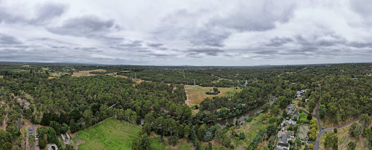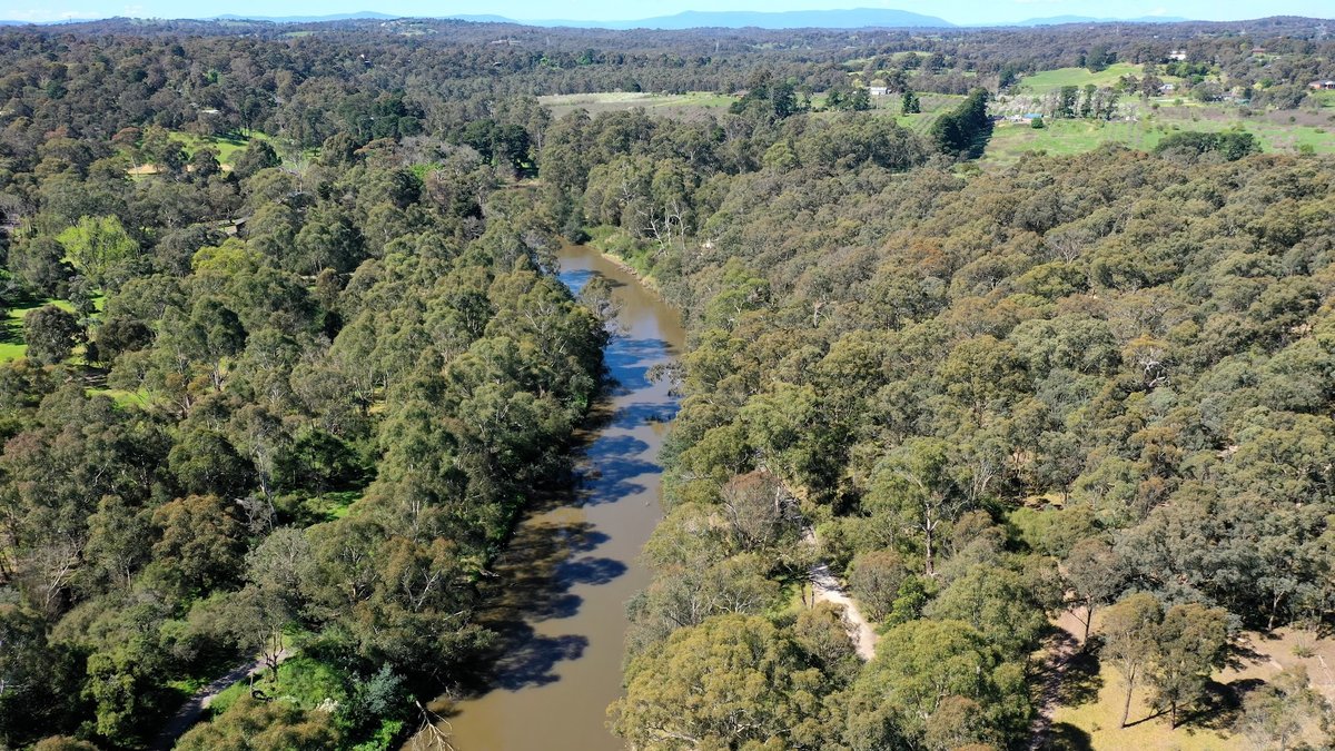 Fitzsimons Reserve Dog Off Leash Area is a sprawling, multi-use recreational space located in a scenic natural setting alongside a river in Australia. The park features expansive, undulating grassy fields that provide ample room for dogs to run and play. While parts of the reserve are dedicated to organized sports, such as the fenced soccer fields with large lighting towers, there are significant open areas designated for off-leash activities. The terrain is characterized by gentle slopes and is bordered by dense native bushland and mature trees, which offer patches of natural shade throughout the day. Facilities visible across the reserve include a children's playground equipped with a large shade sail, park benches for owners to rest, and a dedicated parking lot providing convenient access. The atmosphere is peaceful and open, successfully blending suburban recreational amenities with a rugged, natural landscape. While a low chain-link fence surrounds the sports oval to manage activity, the broader off-leash areas appear largely unfenced, transitioning naturally into the surrounding woodland and riverside trails, making it ideal for active dogs and their owners.