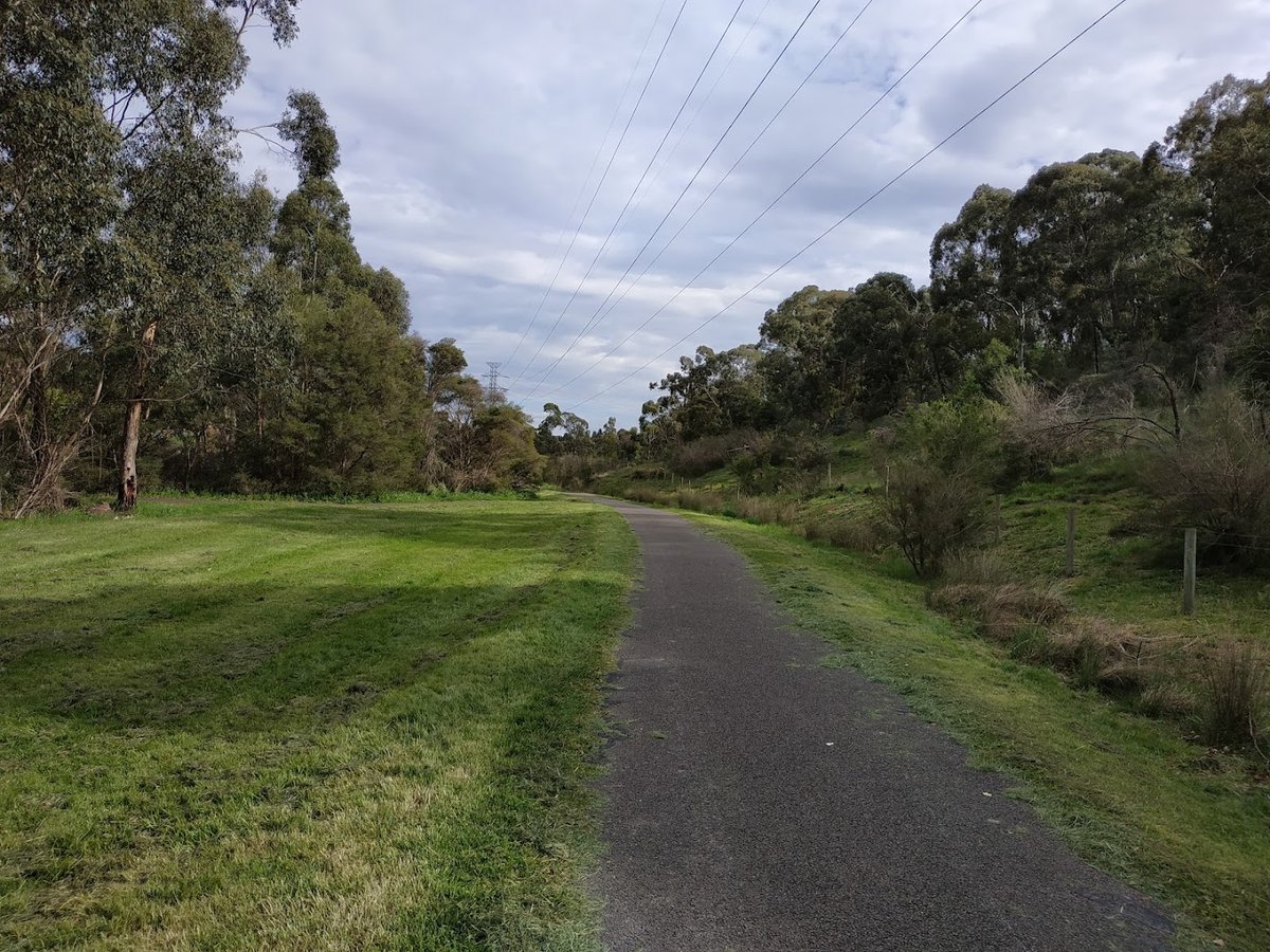 Green Gully Linear Park Dog Off Leash Area is a sprawling, multi-use recreational space located in a natural suburban setting. The park is characterized by its extensive 'Green Gully Trail,' a well-maintained asphalt path that winds through lush greenery and dense clusters of native trees, providing ample natural shade for visitors and their pets. The terrain features a mix of flat stretches and significant grassy slopes, offering a variety of environments for exercise. While the area is designated for off-leash activity, it is not a traditional fully enclosed dog run; instead, it serves as a shared linear corridor with partial post-and-wire fencing along some boundaries. Facilities within the broader park area include a basketball half-court and a swing set, catering to families and local residents. The ground surface is primarily natural grass alongside the paved trail. The atmosphere is peaceful and open, dominated by the surrounding bushland and overhead power lines. There are no visible specialized dog amenities like water stations, agility equipment, or waste bag dispensers in the provided images, suggesting a more naturalistic trail experience.