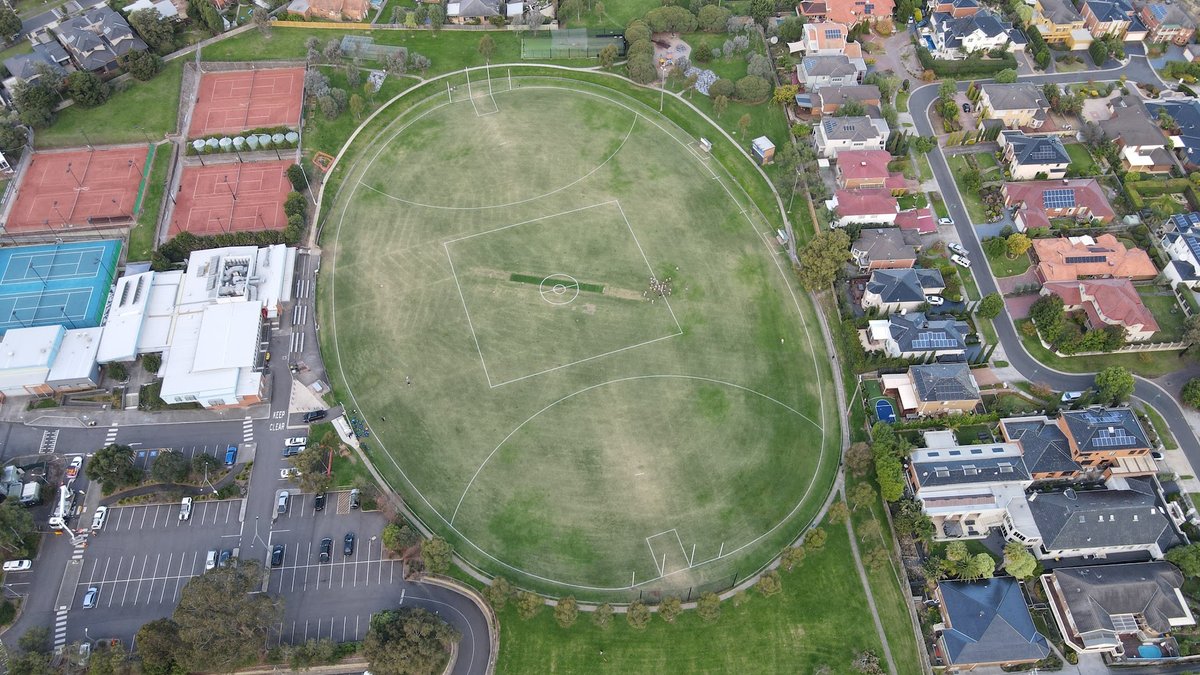 Templestowe Reserve Dog Off Leash Area is a sprawling multi-purpose recreational space located in a suburban setting in Australia. The centerpiece of the park is a massive, well-maintained grassy oval used for sports, which serves as a generous off-leash area for dogs to exercise. The park's surface is predominantly natural grass, though woodchips are used under the playground equipment. While the main field is open and unfenced, the surrounding parkland features rolling slopes and a variety of mature native trees that provide ample natural shade for visitors. Facilities visible include a modern children's playground with swings and climbing structures, several park benches strategically placed for resting, and a large paved parking lot that accommodates many vehicles. The reserve is situated next to tennis courts and a sports pavilion, contributing to a vibrant community atmosphere. Its proximity to the Yarra River corridor adds a scenic, natural backdrop to the area. Although temporary fencing may appear for maintenance, the primary dog exercise area remains an expansive, open-air environment suitable for high-energy activities.