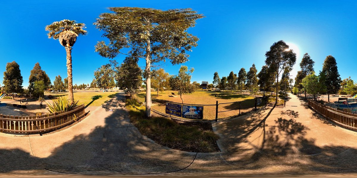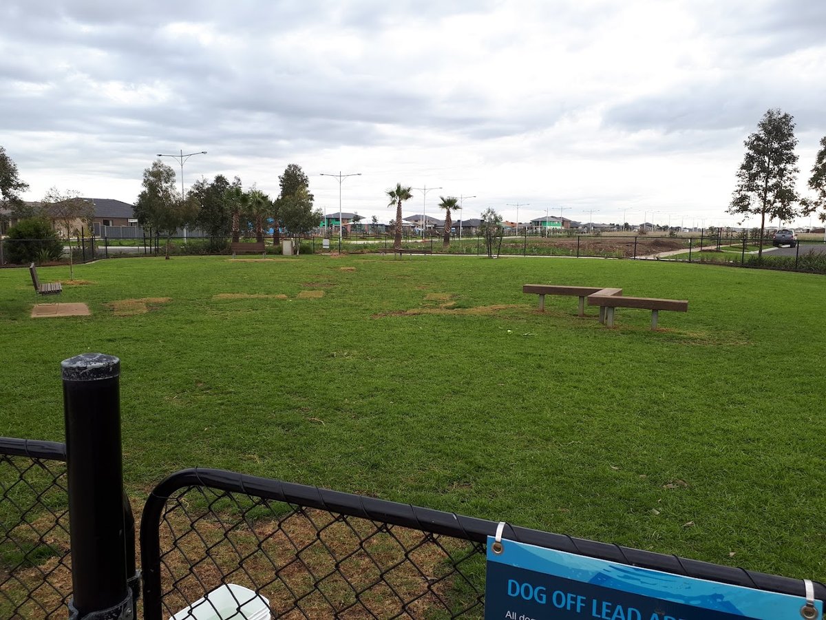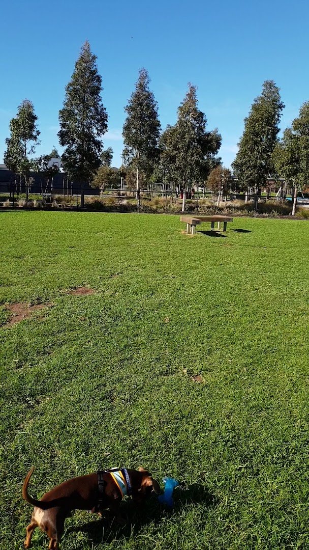Forsyth Park Fenced Dog Park in Australia offers a spacious and secure environment for dogs of all sizes to exercise and socialize off-leash. The dedicated facility is fully enclosed by a sturdy black chain-link fence, ensuring a safe boundary for pets. The primary ground surface is well-maintained green grass, providing a soft area for running, although some high-traffic zones near the entrance and water station consist of dirt and mulch. The park is thoughtfully equipped with essential amenities, including a specialized dog water fountain to keep pets hydrated, multiple wooden benches for owners to rest, and conveniently located trash cans for waste disposal. While the space is largely open and sunny, several mature and young trees are scattered within and around the perimeter, offering patches of natural shade. The overall atmosphere is welcoming and community-focused, bordered by quiet residential streets. As part of the larger Forsyth Park complex, visitors also have access to nearby sports fields for soccer and cricket, as well as a modern children's playground, making it an ideal destination for the whole family.