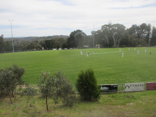 Harris Gully Reserve offers an expansive, naturalistic dog off-leash area characterized by large, open grassy spaces and rolling slopes. The park is heavily wooded with mature eucalyptus and other native trees, providing significant natural shade along the peripheries and walking paths. A well-maintained gravel path winds through the reserve, making it suitable for walking while dogs roam. The atmosphere is serene and rustic, feeling more like a nature reserve than a structured urban park. While a fenced sports oval is adjacent to the area, the primary off-leash sections appear to be unfenced, relying on natural boundaries. Facilities are minimal; there are no visible water stations, toilets, or agility equipment in the provided images. The terrain includes both flat clearings and gentle hills, offering a variety of exercise intensities for dogs. It is an ideal spot for owners seeking a quiet, spacious environment for their pets to explore off-lead amidst Australian bushland. The presence of stadium lighting suggests the adjacent sports field is used for evening events.
