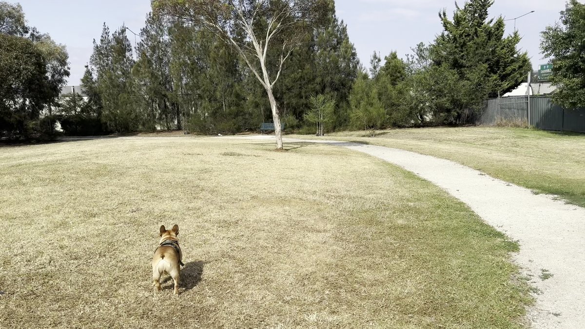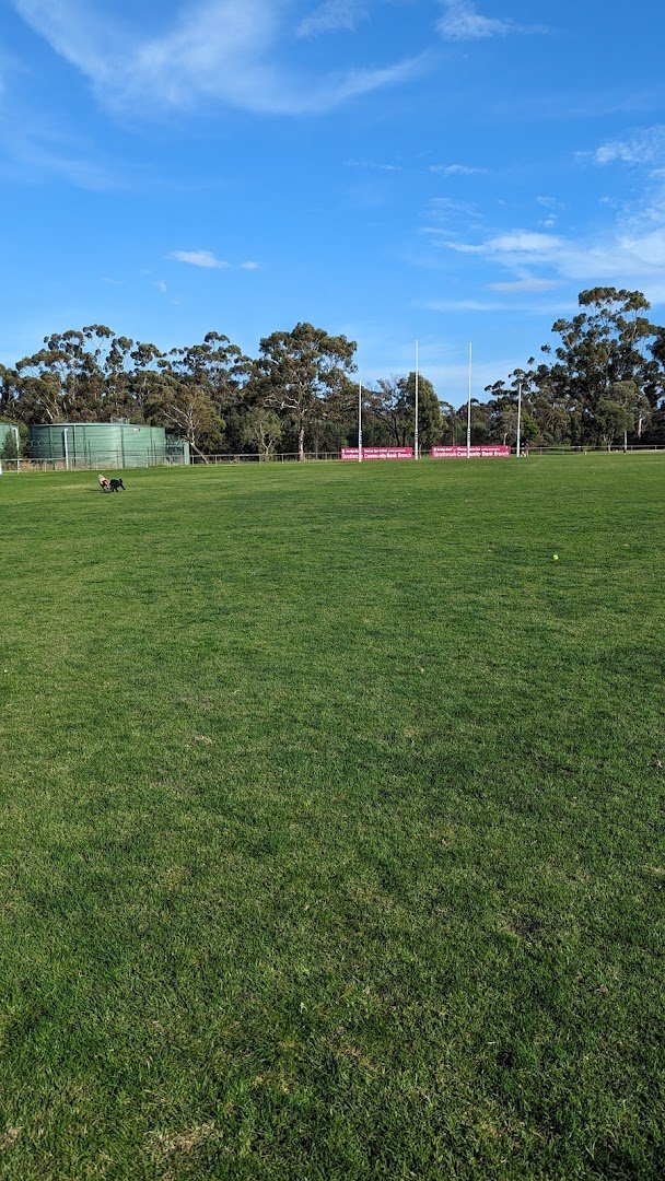 Westmeadows Reserve Dog Off Leash Area offers a sprawling, multi-purpose outdoor space characterized by its vast open fields and natural surroundings. The park features a large, well-maintained sports oval that provides ample room for dogs to run and play off-leash. The ground surface is primarily grass, ranging from lush green on the playing fields to more natural, dry turf in the surrounding reserve areas. Mature trees are scattered throughout the park, providing significant natural shade for both pets and owners. For human comfort, several park benches are strategically placed along the walking paths. The reserve includes a mix of paved and gravel pathways, making it accessible for walking. While there is some metal fencing visible around the perimeter and the sports field, it appears to be an open-style reserve rather than a fully enclosed small dog park. High-mast lighting is present, likely for the sports facilities, which may provide some visibility during twilight hours. The overall atmosphere is peaceful and spacious, ideal for high-energy dogs that require plenty of room to roam in a scenic Australian park setting.