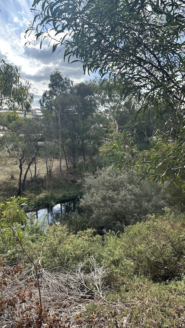 Willowbrook Reserve Dog Off Leash Area is a versatile community park in Australia, characterized by its vast open spaces and varied terrain. The reserve features a large, well-maintained grassy sports oval, which is partially enclosed by a low metal rail fence. Adjacent to the flat playing fields are expansive, sloping grassy hills, ideal for off-leash exercise and offering views of the surrounding suburban landscape. A paved walking path provides easy access throughout the park, bordered in sections by wire fencing. For families, there is a modern playground set on a woodchip surface, shaded by mature eucalyptus trees. The park also includes a natural riparian zone with a small creek, adding to the environmental diversity. While the images show ample space for dogs to run and play, specific dog-centric amenities like agility equipment or water stations are not explicitly visible. The presence of tall floodlights suggests the area is used for evening sports, and its proximity to a major road is indicated by nearby highway views.