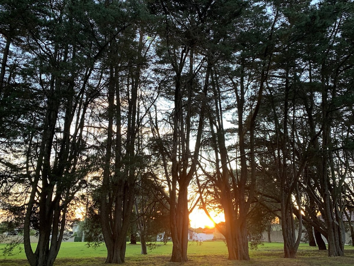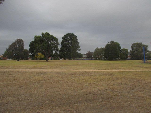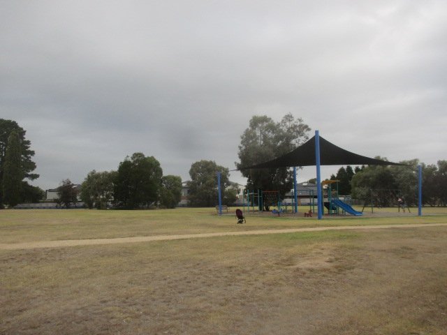 Columbia Park Dog Off Leash Area in Australia is a sprawling suburban reserve that offers a versatile environment for both dogs and their owners. The park is characterized by its vast, open grassy spaces, which provide ample room for dogs to run and play off-leash. The terrain is primarily flat with a mix of lush green lawns and drier, natural grass areas depending on the season. Mature trees line parts of the park, offering scenic views and natural shade, particularly striking during the golden hour. For community use, the park includes a well-equipped playground area featuring a large black shade sail for sun protection. A gravel walking path meanders through the reserve, making it accessible for strollers and casual walkers. Sports facilities, such as cricket nets and fenced sports fields, are also integrated into the space. While there is perimeter fencing along some boundaries, the area maintains an open, airy feel. Seating is available via benches located near the play equipment. The park's atmosphere is tranquil and family-friendly, serving as a central hub for local outdoor recreation and pet exercise.