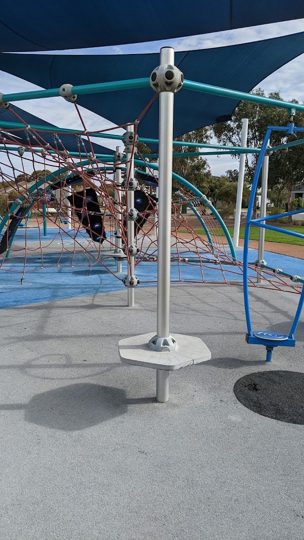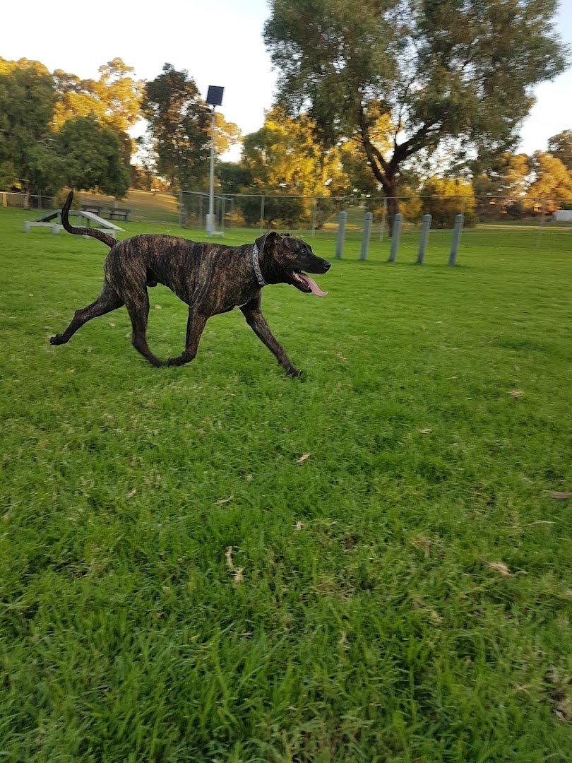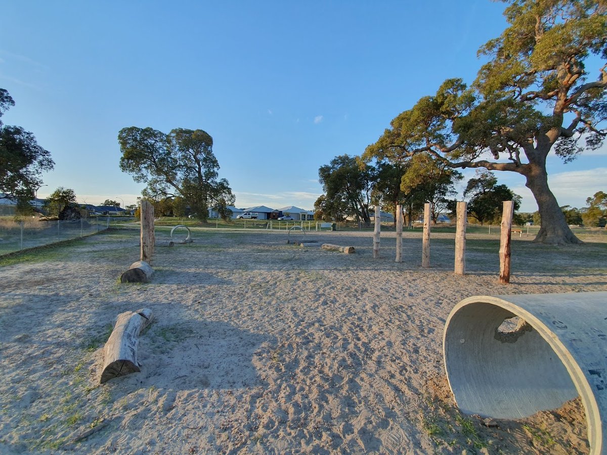 Byford Bark Park is a spacious and well-equipped off-leash dog exercise area. The park features multiple sections, including large open grassy fields and areas with a more sandy or dirt-based surface. It is fully enclosed with secure chain-link and metal fencing. For canine enrichment, the park offers a variety of agility equipment such as concrete tunnels, wooden logs for balancing, vertical poles for weaving, and ramps. Human amenities include benches for resting, some of which are sheltered, and a water station for both dogs and owners. Waste management is facilitated by conveniently located trash cans with integrated waste bag dispensers. The park is dotted with large, mature trees providing natural shade, and there are also solar-powered lights for visibility. Adjacent to the dog exercise areas are modern children's playgrounds with shade sails, climbing structures, and swings, making it a family-friendly destination. The overall atmosphere is open, active, and well-maintained.