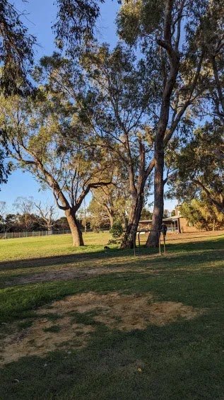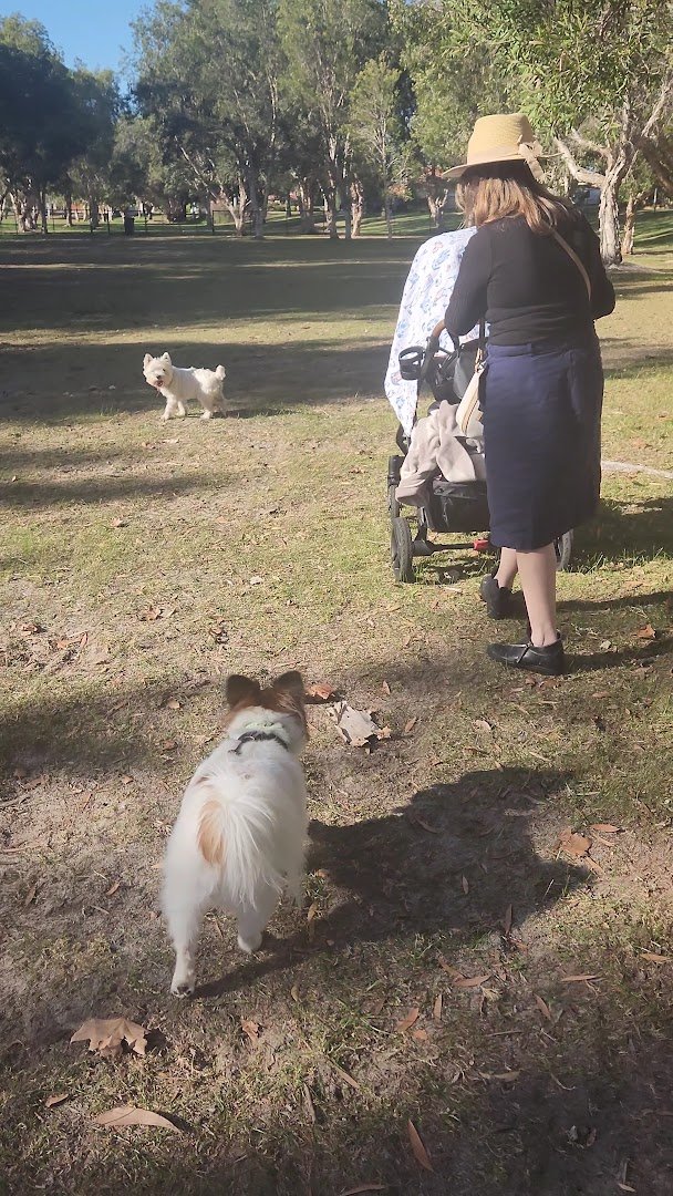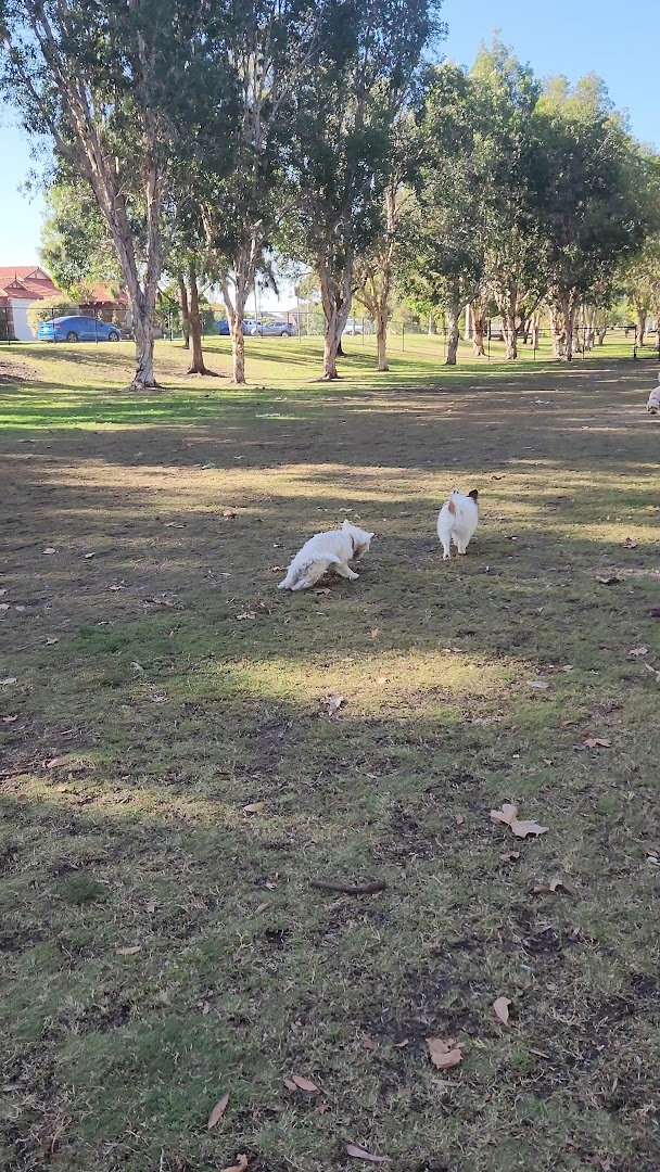 Ranford Dog Park in Australia offers a sprawling and picturesque environment for canine exercise and socialization. The park is characterized by its expansive, well-manicured grassy fields, which provide ample room for dogs of all sizes to run freely. It is a fully enclosed facility, utilizing a mix of sturdy chain-link fencing with wooden posts and decorative black metal fencing to ensure a secure off-leash experience. One of the park's standout features is the abundance of mature eucalyptus trees that line the perimeter and dot the landscape, offering significant natural shade and a pleasant, park-like atmosphere. For dogs that enjoy a challenge, there is a dedicated area with agility equipment, including a tunnel and a jumping hoop. The park also includes practical amenities like conveniently located trash cans to help maintain cleanliness. While the primary surface is soft grass, some areas under the trees feature a natural mix of dirt and fallen leaves. The presence of a nearby water body adds to the scenic beauty of the location, making it a popular spot for local pet owners seeking a tranquil yet functional outdoor space.
