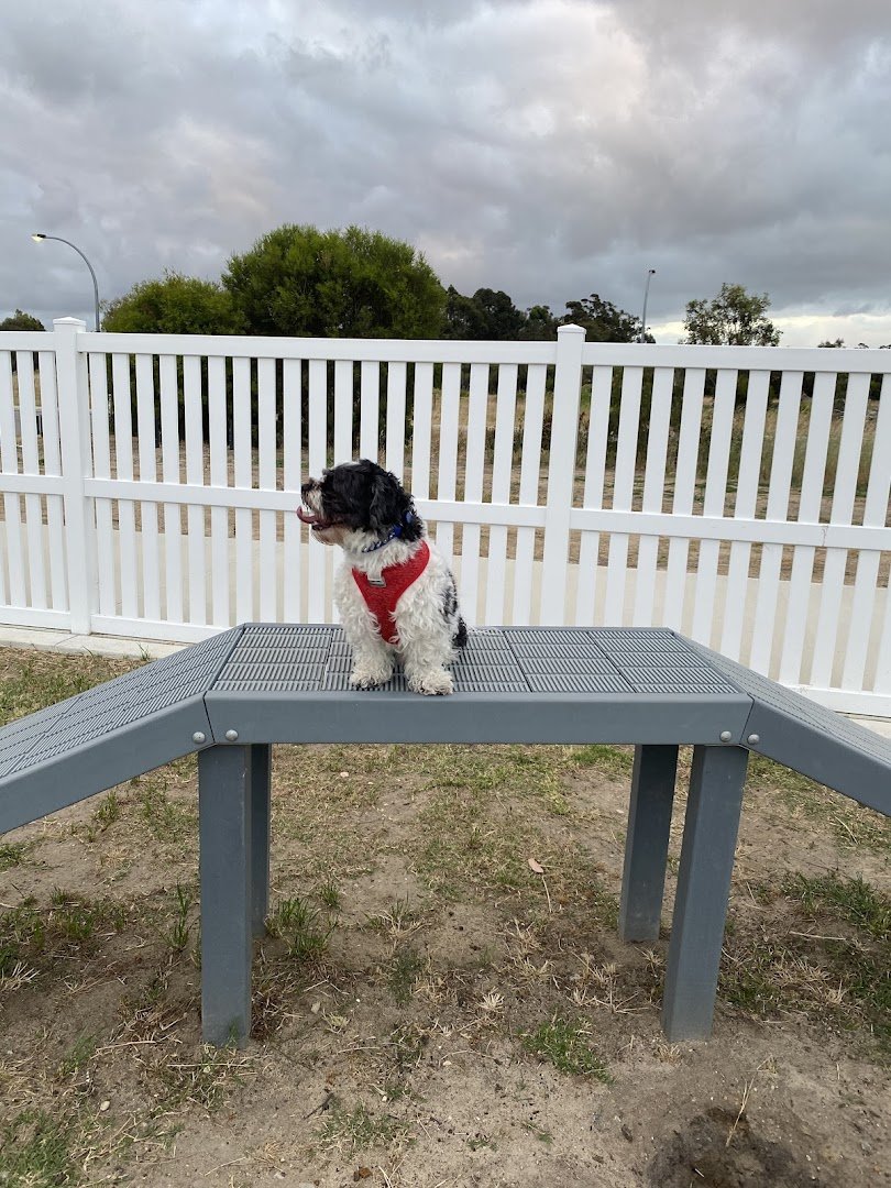 Mary Crescent Reserve in Bassendean offers a spacious and well-equipped off-leash dog exercise area. The park features multiple fenced sections, including a dedicated area for small dogs characterized by a white picket-style fence. The terrain is a mix of large open grassy fields and areas with more sandy or dirt surfaces. Facilities are extensive, including various agility equipment such as tunnels, ramps, logs, and weave poles. For owners, there are several benches, sheltered picnic tables, and paved walking paths. Mature trees throughout the reserve provide ample natural shade, and a dedicated pavilion offers additional cover. The park is well-maintained with clear signage regarding off-leash rules and waste disposal. The presence of a building suggests potential toilet facilities, though not explicitly confirmed as public. The overall atmosphere is peaceful and community-oriented, set against a backdrop of suburban greenery and open space.
