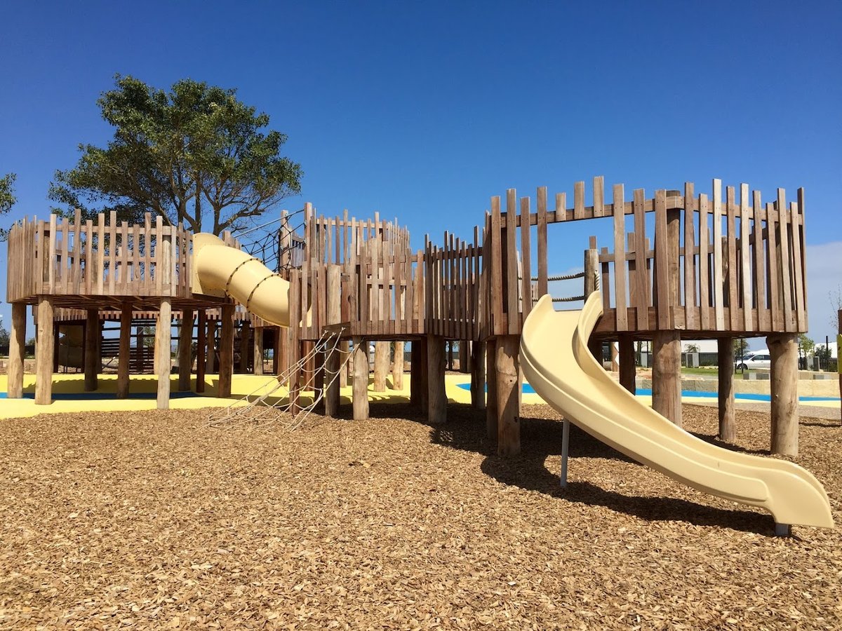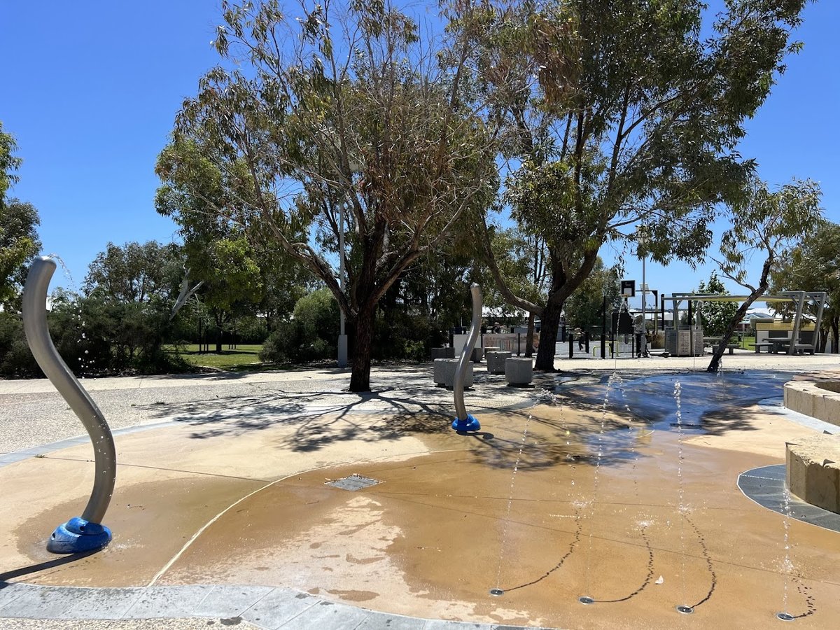 Kinkuna Park is a comprehensive community space located in Australia, offering a diverse range of facilities for residents and their pets. The park is characterized by its expansive, well-maintained green spaces, including a large open field equipped with goal posts for sports and recreation. For dog owners, the park provides dedicated fenced-off areas that allow for safe, off-leash exercise. These sections feature a mix of lush grass and paved concrete paths, ideal for walking. The park is highly family-friendly, featuring a significant wooden playground structure with multiple slides and climbing elements set on a soft woodchip base. Additionally, a modern water splash pad with interactive fountains provides a popular cooling-off spot during warmer weather. Natural shade is abundant thanks to numerous mature trees scattered throughout the grounds, supplemented by large shade sails over key seating and play areas. Practical amenities such as trash cans, benches, and clear signage are visible, contributing to a clean and organized environment. The overall atmosphere is bright, spacious, and welcoming, making it a versatile destination for sports, pet play, and family outings.