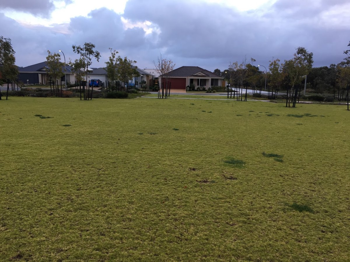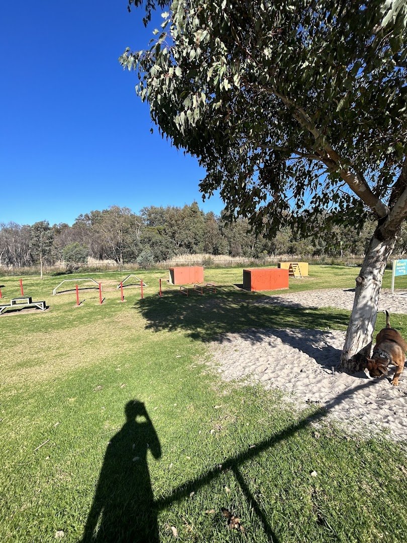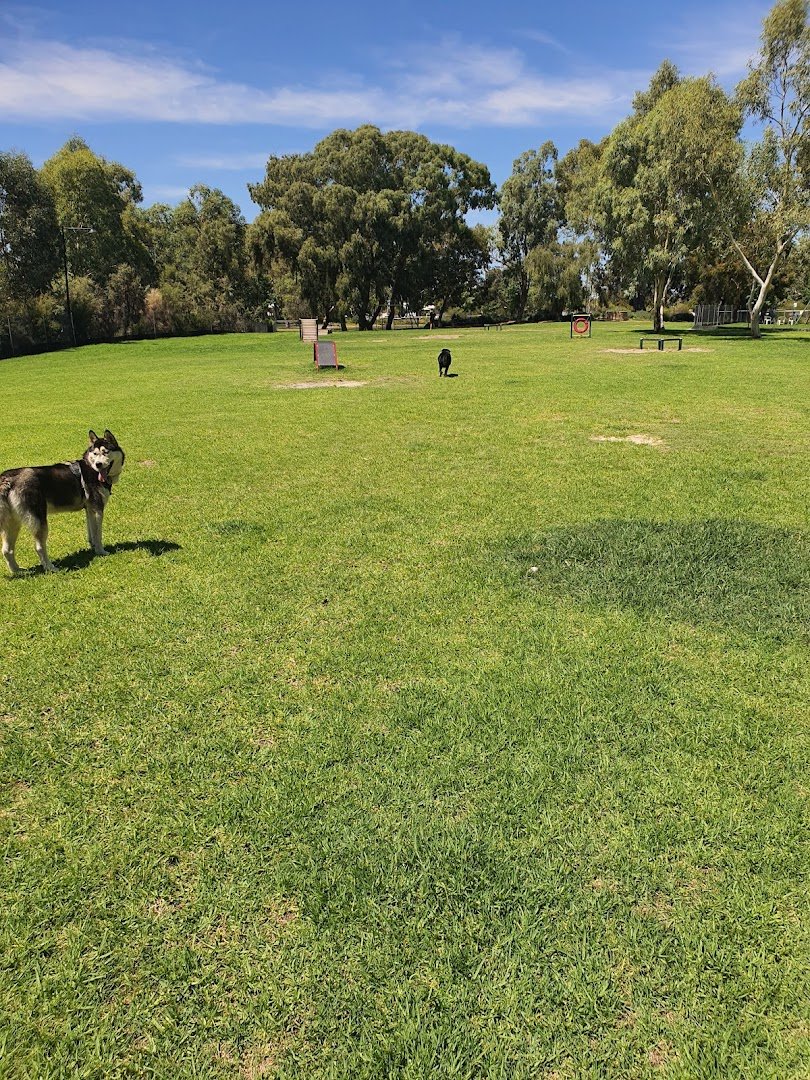 The dog park offers a diverse range of environments, including a vast, fenced-in grassy oval perfect for high-energy running and a separate, shaded woodland area with a natural mulch surface. The facility is well-equipped with essential amenities like double-gated entries, trash cans, and several metal benches for owners. While the main areas are primarily grass and dirt, there is also a modern, adjacent playground featuring rubberized flooring and a large shade sail. Public toilets are conveniently located near the playground area. The park's perimeter is secured with chain-link fencing, and tall light poles suggest the area may be usable during early evening hours. Agility equipment, such as hoops and hurdles, is occasionally available on the grass, adding an interactive element for training. With its mix of open space and mature trees, the park provides a versatile and safe off-leash environment for dogs of all sizes. The atmosphere is community-focused and spacious, catering to various dog breeds and activities.