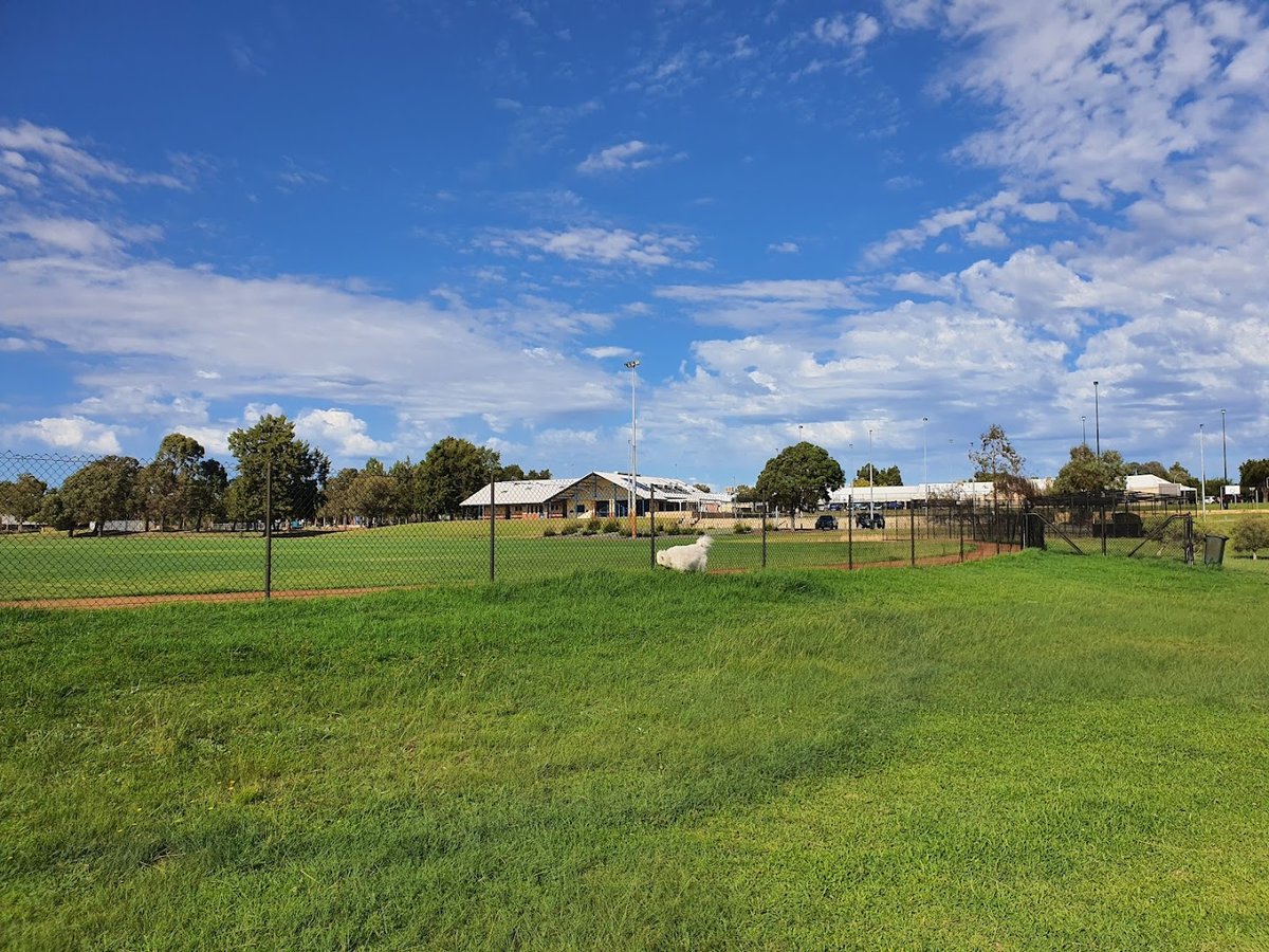 Ellenbrook Dog Exercise Park is a large, multi-zoned facility in Australia designed for off-leash activity. The park features expansive, well-maintained grassy fields alongside areas with sand and dirt surfaces. It is fully enclosed by secure fencing, including chain-link and picket-style sections, with double-gate entries for safety. A standout feature is the extensive agility equipment, which includes ramps, tunnels, hurdles, and natural log obstacles. For human visitors, the park provides benches and a large sheltered gazebo for shade and rest. The landscape is varied, with both flat expanses and gentle slopes, and is dotted with mature trees that offer natural shade. Practical amenities like trash cans and tall floodlighting for evening use are also visible. The park's size and diverse facilities create a vibrant, community-focused environment suitable for dogs of all sizes to exercise and socialize.