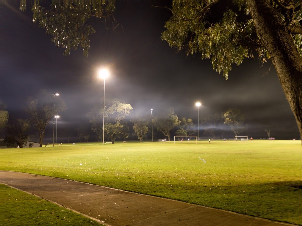 Elcar Park Dog Exercise Area is a comprehensive facility featuring multiple zones designed for canine activity and socialisation. The park includes a dedicated fenced off-leash area with a varied terrain consisting of grass, sand, and wood-chip mulch surfaces. A highlight of the facility is the specialized agility section, which contains equipment such as an A-frame ramp and hurdles on a sandy base. For the comfort of both pets and owners, the park provides significant natural shade from mature trees, as well as a permanent covered picnic pavilion with bench seating. Practical amenities are well-integrated, including multiple communal water bowls, trash cans, and paved concrete walking paths that navigate through the space. The presence of high-intensity floodlighting indicates the park is accessible for evening use. While the dog-specific areas are securely fenced with chain-link borders, the wider park environment also features large open sports fields and a children's playground, making it a versatile community destination.