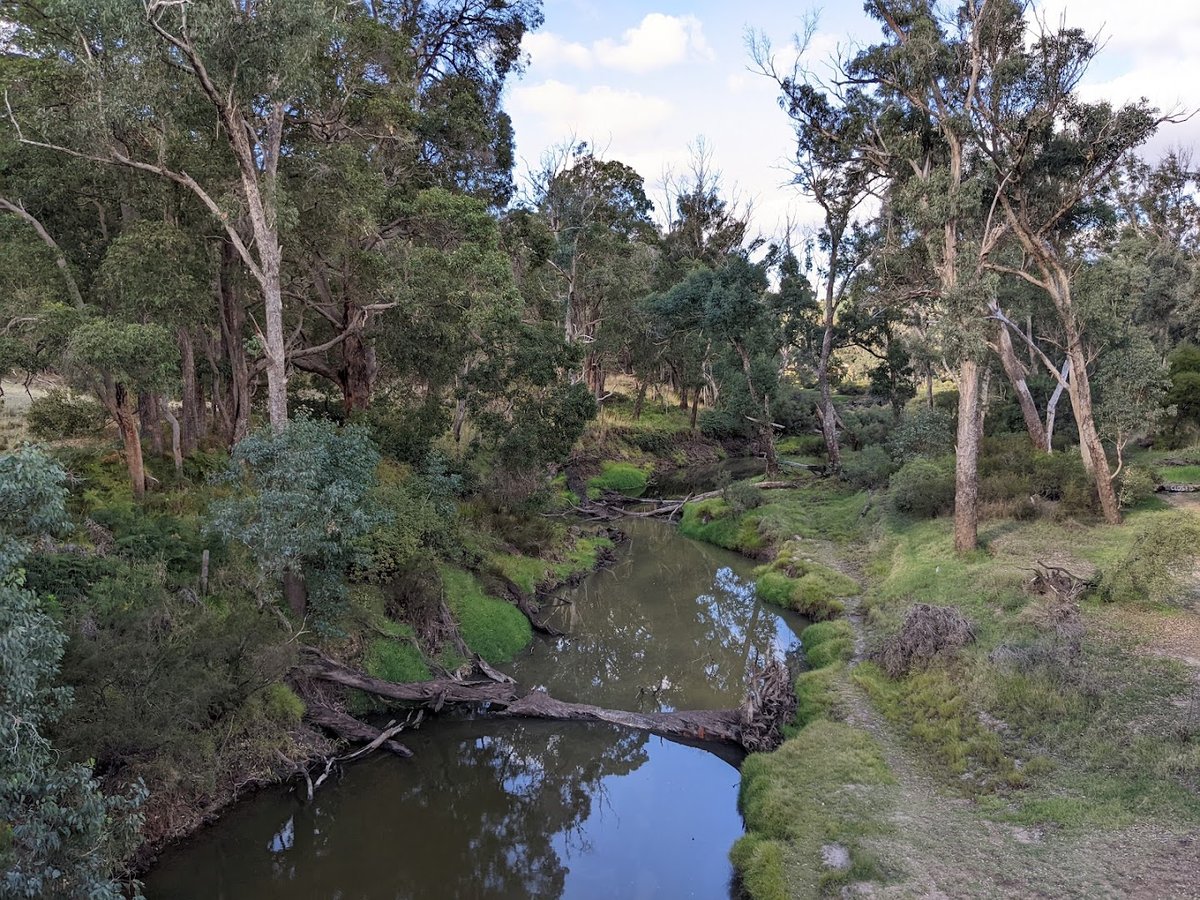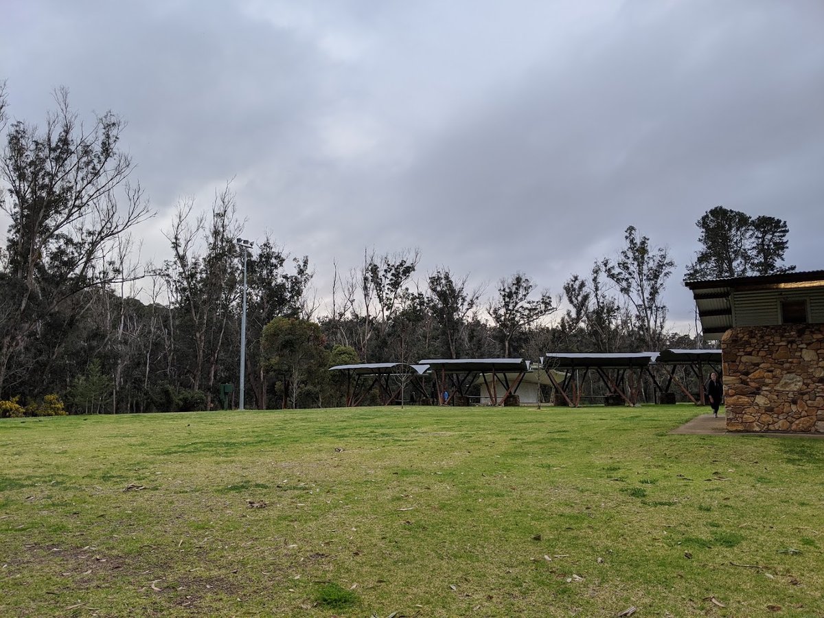 Nannup Foreshore Park Dog Exercise Area is a spacious and scenic recreational destination located along a natural riverbank. The park is characterized by its large, open grassy fields which provide plenty of room for dogs to run and play in an open-plan setting. Mature eucalyptus trees are scattered throughout the landscape, offering abundant natural shade, while several modern picnic pavilions provide sheltered spots for visitors to rest. Facilities include a stone building, likely containing public toilets, and a tall light pole suggesting the area is equipped for evening use. For families, there is a comprehensive playground with slides and climbing equipment set on a woodchip surface, adjacent to a fenced basketball court. Parking is available on unpaved dirt tracks shaded by the forest canopy. A natural waterway borders the park, adding to the tranquil atmosphere and providing water access. While designated as a dog exercise area, no specific perimeter fencing is visible, indicating it is an unfenced space. The terrain is generally flat and well-maintained, making it accessible for various activities.